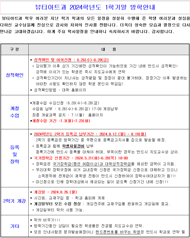 뷰티아트과 학우 여러분 지난 학기 학과의 모든 일정을 성실히 수행해 준 학생 여러분과 성심을 다하신 교수님들께 진심으로 감사와 치하의 인사를 전합니다. 더욱더 성숙한 모습과 열정으로 다시 만나길 고대하겠습니다. 하계 주요 학사일정을 안내하니 숙지하시기 바랍니다. 감사합니다.