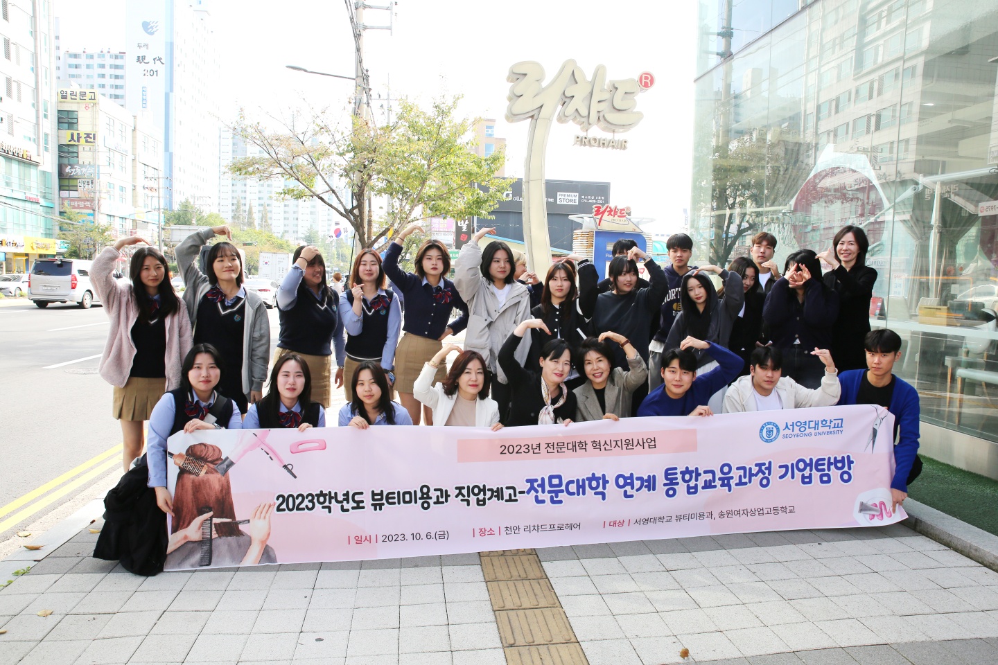 ○ 2023년 전문대학 혁신지원사업으로 직업계고와 전문대학이 기업과 연계된 통합연계교육과정 운영으로 송원여자상업고등학교 고 3학생 8명과 서영대학교 뷰티미용과 17명으로 총 25명이 천안 리챠드프로헤어로 기업탐방을 실시했다.