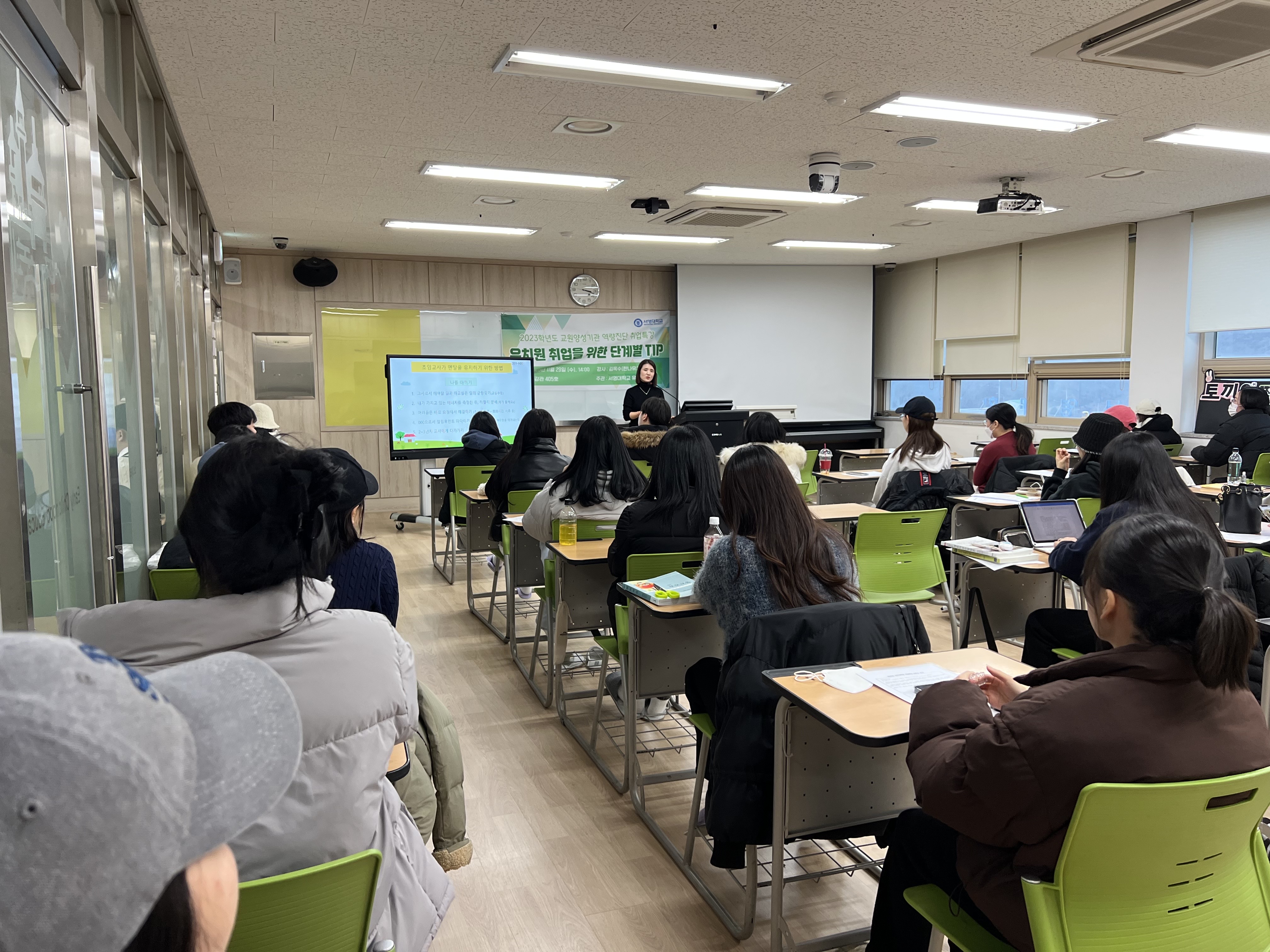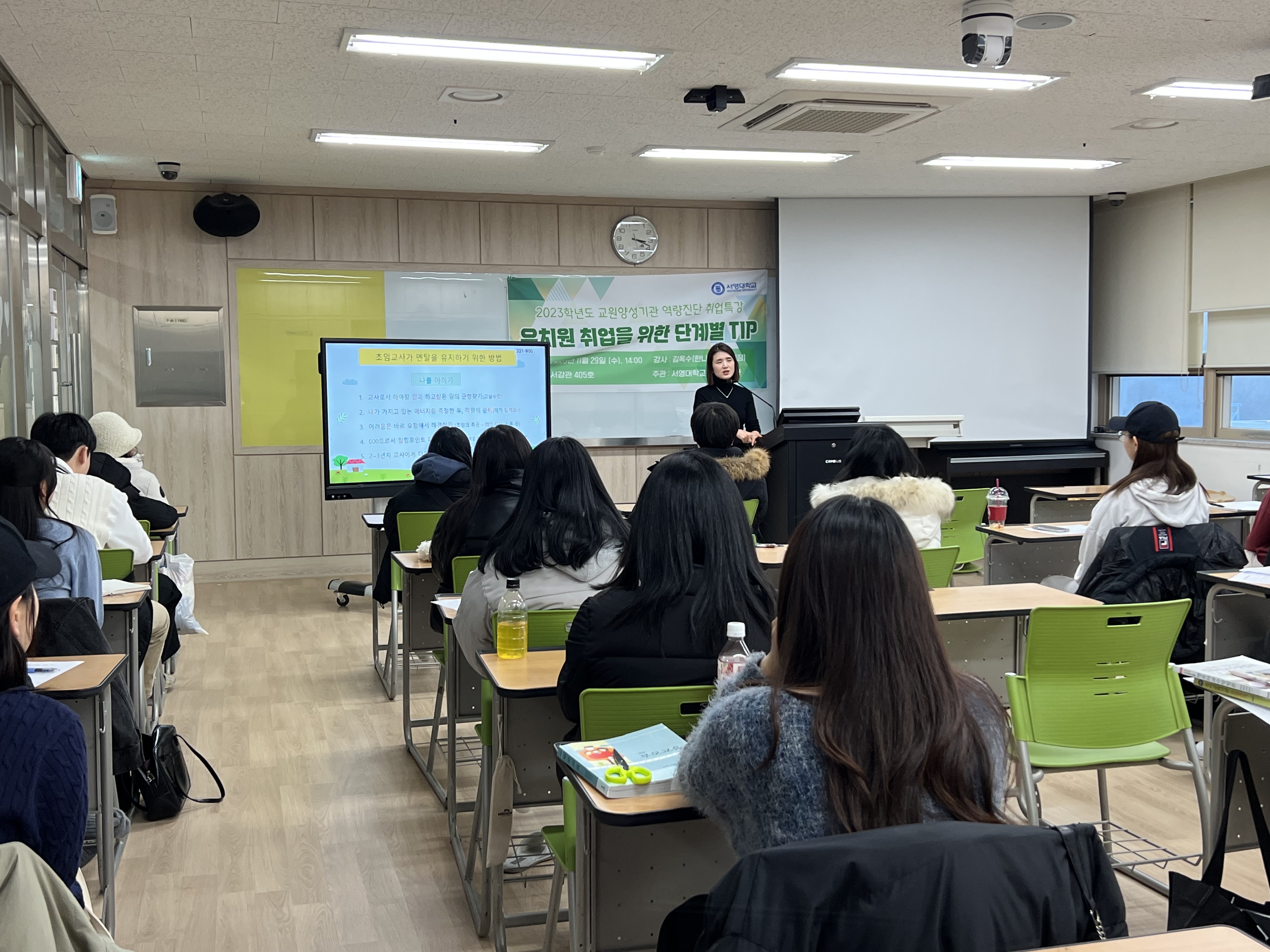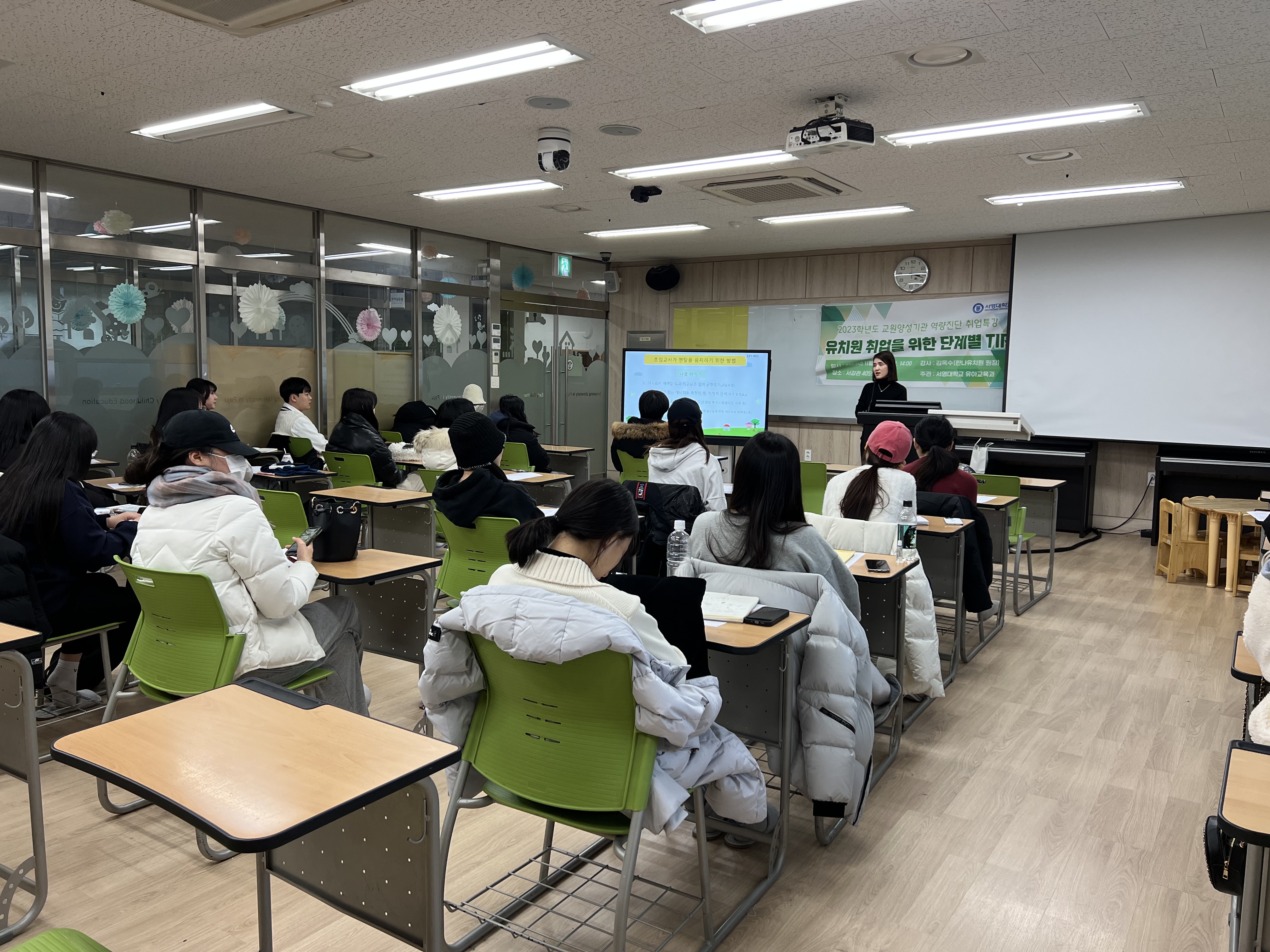 - 내용 : 유아교육과 3학년 재학생을 대상으로 유아교육기관 원장님께서 취업과 관련된 내용들을 정리하여 알려주셨고, 학생들과의 질의응답 시간을 가져 궁금증을 해소해주셨습니다.