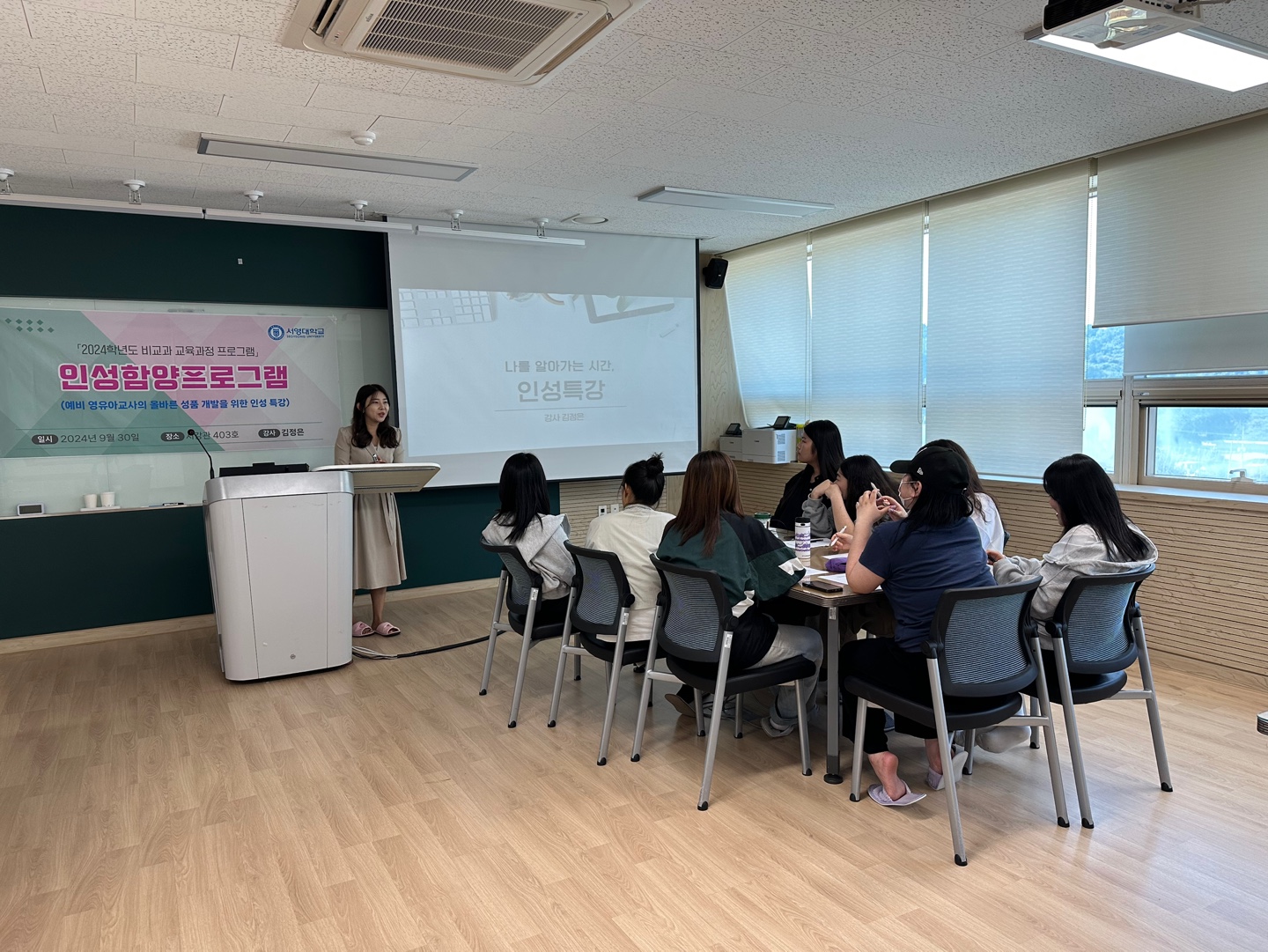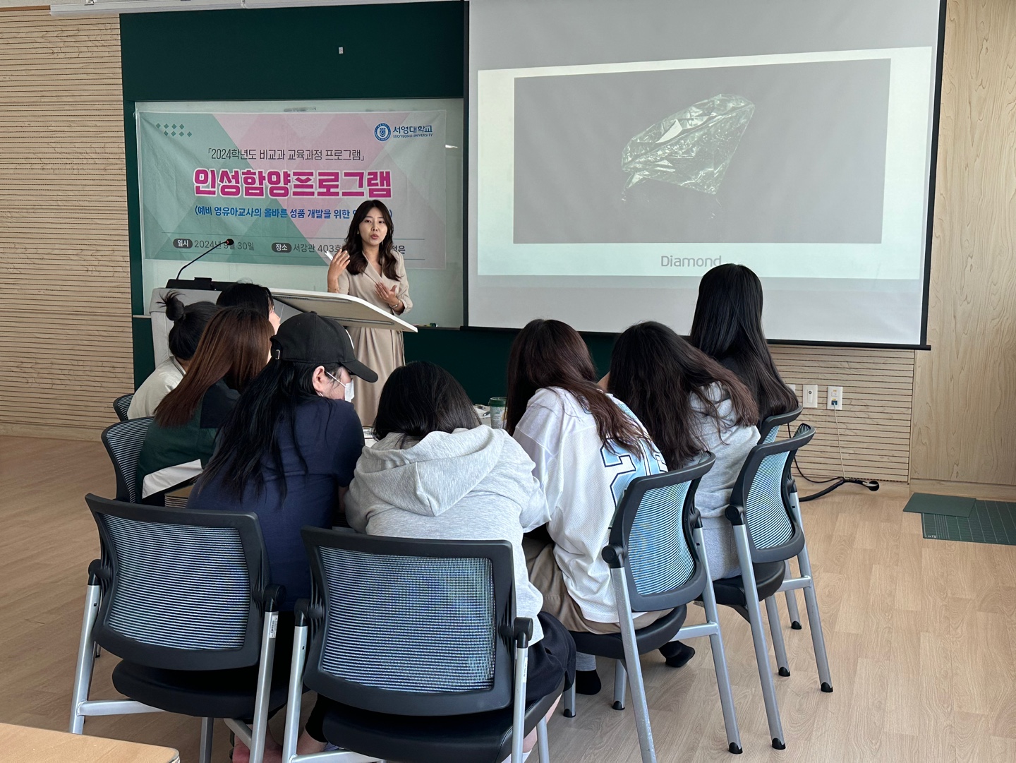 - 내용 : 그림을 통해 자기를 이해해보는 시간을 가져보고 DISC검사를 통해 나의 성격유형을 파악해보았습니다. 또한, 나의 강점을 찾아본 후 유아교사로서 필요한 강점과 피드백을 친구들끼리 교환해보고, 유아 및 학부모와의 상호작용에서의 소통방법, 공감과 팀워크 향상 게임 등을 알아보며 예비 영유아교사의 올바른 인성을 기르는 시간이 되었습니다.