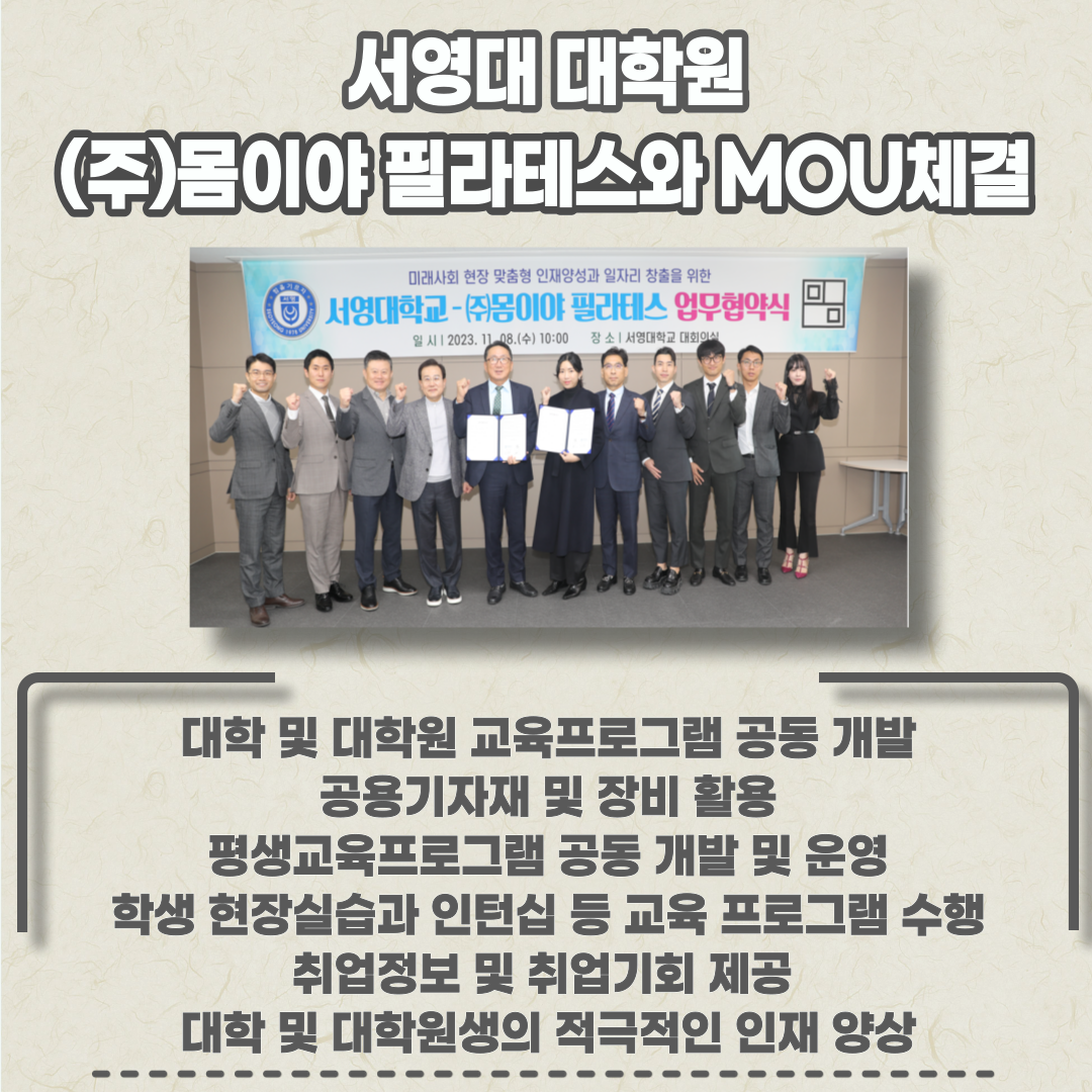 서영대 대학원, (주)몸이야 필라테스와 MOU 체결
