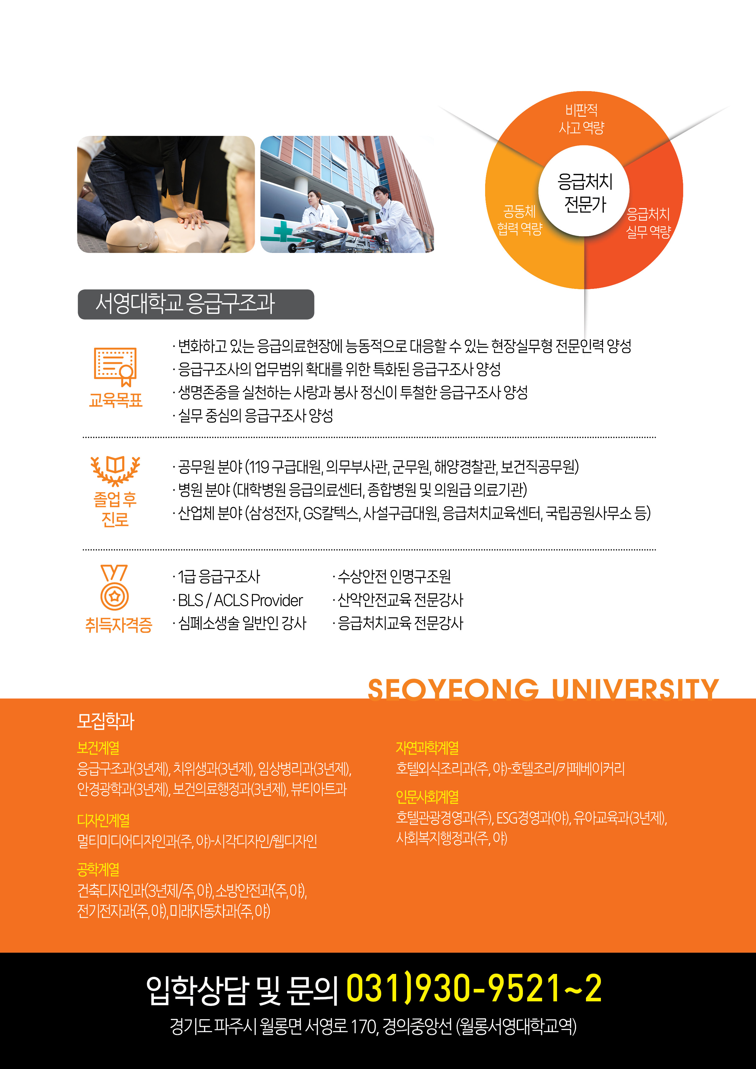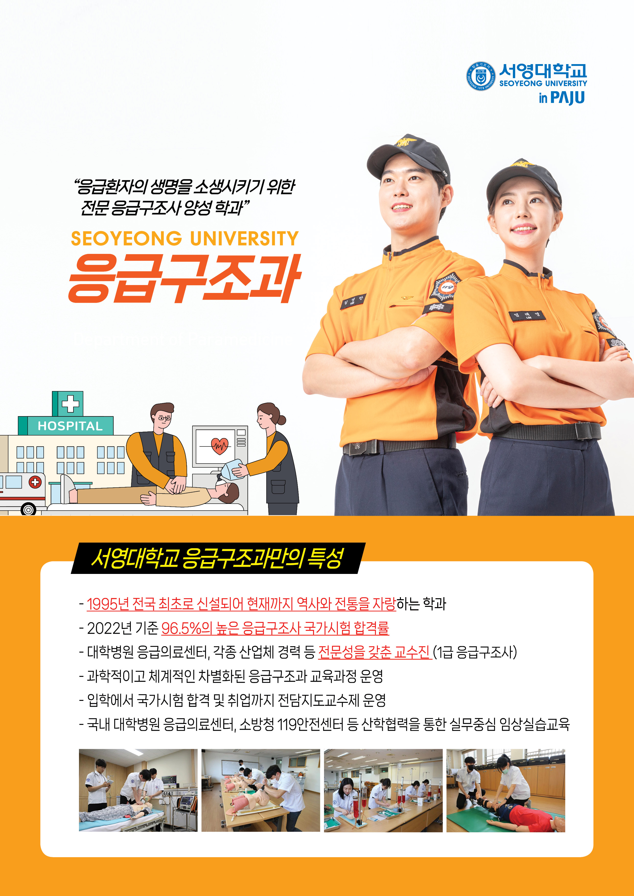 “응급환자의 생명을 소생시키기 위한 전문 응급구조사 양성 학과” SEOYEONG UNIVERSITY 응급구조과 Department of Paramedicine # 서영대학교 응급구조과만의 특성 1995년 전국 최초로 신설되어 현재까지 역사와 전통을 자랑하는 학과 2022년 기준 96.5%의 높은 응급구조사 국가시험 합격률 대학병원 응급의료센터, 각종 산업체 경력 등 전문성을 갖춘 교수진 (1급 응급구조사) 과학적이고 체계적인 차별화된 응급구조과 교육과정 운영 # 교육목표 변화하고 있는 응급의료현장에 능동적으로 대응할 수 있는 현장실무형 전문인력 양성 응급구조사의 업무범위 확대를 위한 특화된 응급구조사 양성 생명존중을 실천하는 사랑과 봉사 정신이 투철한 응급구조사 양성 실무 중심의 응급구조사 양성 # 졸업 후 진로 공무원 분야 (119 구급대원, 의무부사관, 군무원, 해양경찰관, 보건직공무원) 병원 분야 (대학병원 응급의료센터, 종합병원 및 의원급 의료기관) 산업체 분야 (삼성전자, GS칼텍스, 사설구급대원, 응급처치교육센터, 국립공원사무소 등) # 취득자격증 1급 응급구조사 BLS / ACLS Provider 심폐소생술 일반인 강사 수상안전 인명구조원 산악안전교육 전문강사 응급처치교육 전문강사 입학에서 국가시험 합격 및 취업까지 전담지도교수제 운영 국내 대학병원 응급의료센터, 소방청 119안전센터 등 산학협력을 통한 실무중심 임상실습교육