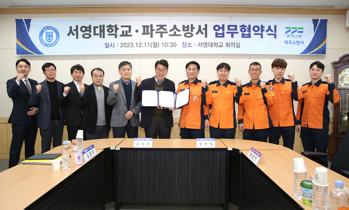 O. 우리대학(총장 김정수)은12월11일(월) 파주소방서(서장 정찬영)와 지역사회발전과 안전한 파주시를 만들기 위한 업무협약을 체결하였다. 서영대학교 회의실에서 진행된 협약식은 서영대학교 부총장 김순곤, 교무처장 임창주, 입학홍보처장 장철인, 응급구조과 학과장 신요한 외 서영대학교 관계자와 파주소방서 서장 정찬영, 소방행정과장 황양연 외 파주소방서 관계자 12명이 참석하였다.