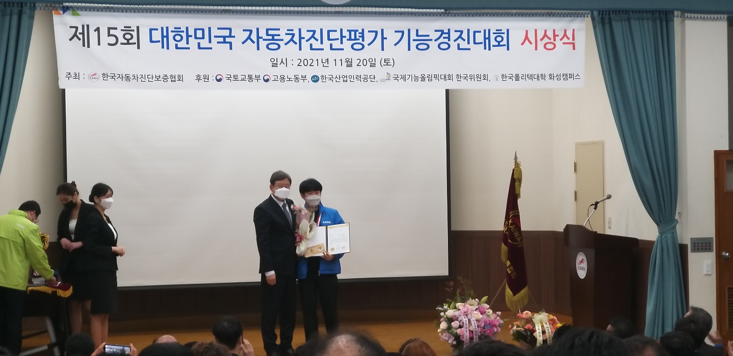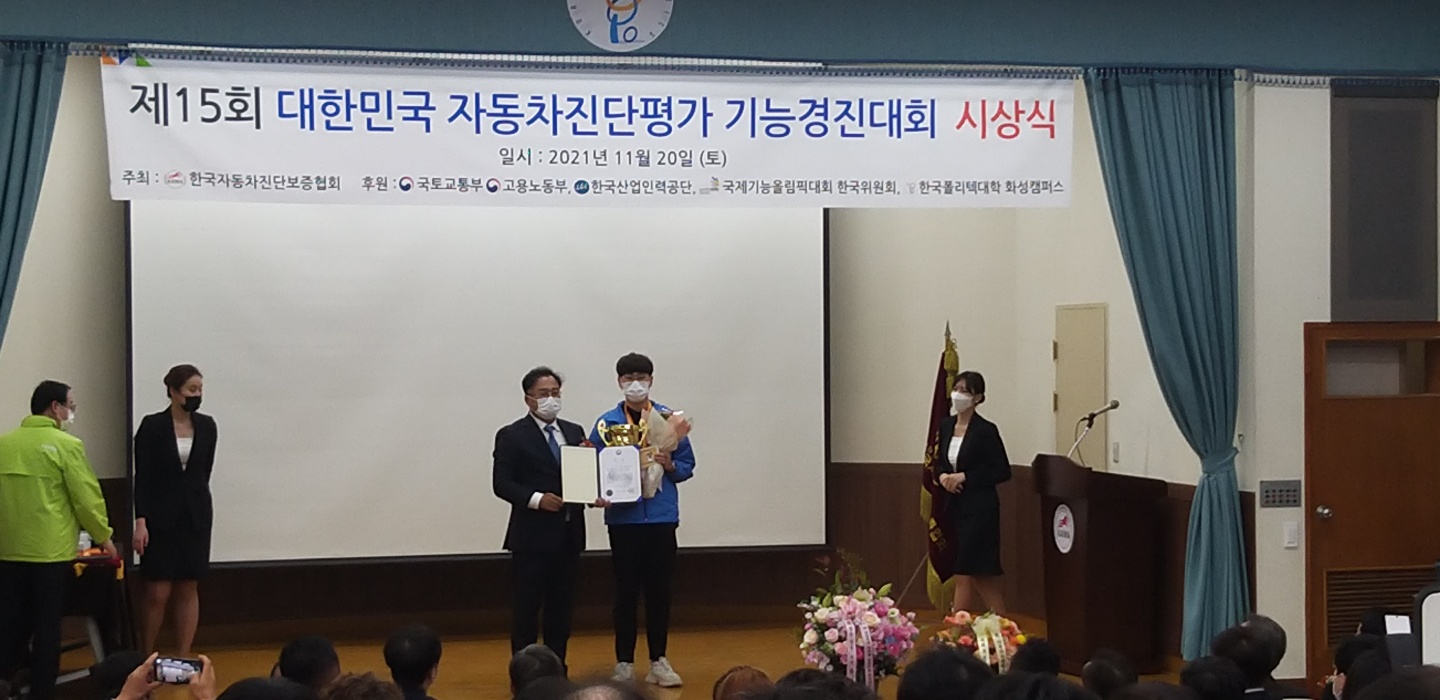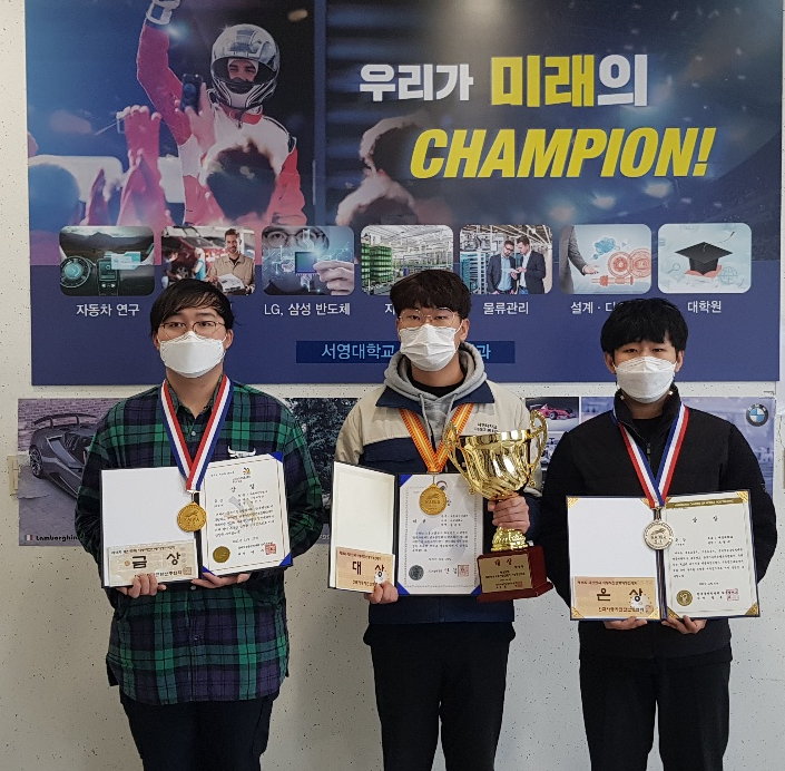자동차의 성능과 사고수리 유, 무 그리고 다양한 옵션의 평가를 통해 진단평가 가격을 결정하는 진단평가사는 4차 산업 중에서도 미래의 유망 직종으로 올해 국가에서 선정된 전문성을 요구하는 진단 기술입니다. 다가올 전기자동차와 자율주행자동차의 평가도 진단평가사의 큰 역활 중 하나입니다. 2021년 11월 20일 토요일. 이런 진단평가사들의 실력을 겨루는 '제15회 대한민국 자동차진단평가 경진대회' 학생부에 출전한 1학년 홍*혁(대상. 고용노동부 장관상), 2학년 장*욱(금상), 조*수(은상). 단체상, 우수지도자상(송*현교수) 을 수상했습니다. 또한, 일반부에 참여한 19학번 김*겸(주, 모터원 근무)님은 일반부 대상(국토교통부장관상)을 수상하는 쾌거를 거두었다. 전국에 대학교에서 출전한 이번 대회에서 당당히 서영대학교 학생들과 미래자동차과가 뛰어난 성과를 거둬 다시금 위상을 높혔습니다. 수상한 학생들 그리고 대회 준비에 함께 뜨거운 열정을 함께한 모든 학생들에게 진심으로 감사와 축하를 드립니다. 이들 모두가 미래자동차과 경쟁력이고 힘입니다.