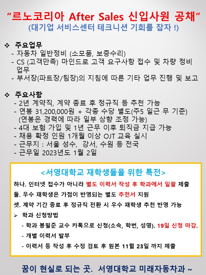 르노코리아 본사 서비스지원팀 최*준팀장께서는 "파주에 위치한 미래자동차과가 어느 대학보다도 훌륭한 시설과 교과프로그램을 갖추고 있어 너무 놀랍습니다. 그러한 훌륭한 시설과 교육프로그램을 이수한 서영대학교 학생들이 르노코리아에 많은 지원을 했으면 너무 좋을  것 같습니다." 라고 채용 설명회를 마치신 소감을 얘기하셨습니다.