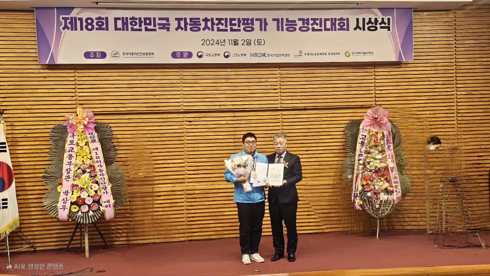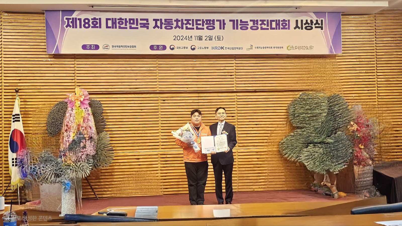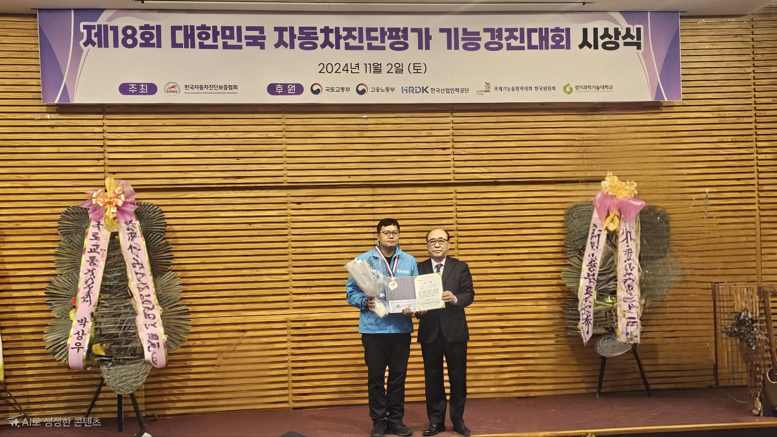 대회에서 4명의 학생이 입상을 하게 되었고 일반부 부분 대상(국토교통부 장관상)에 2학년 김*영 (대회 최초로 여성 수상자가 탄생), 금상(국제기능올림픽한국원회 회장상) 3학년 김*욱, 학생부 부분 은상(경기과학기술대학교 총장상) 4학년 조*선, 동상(한국자동차진단보증협회 회장상)4학년 심*보 학생이 영애의 수상을 하였습니다.