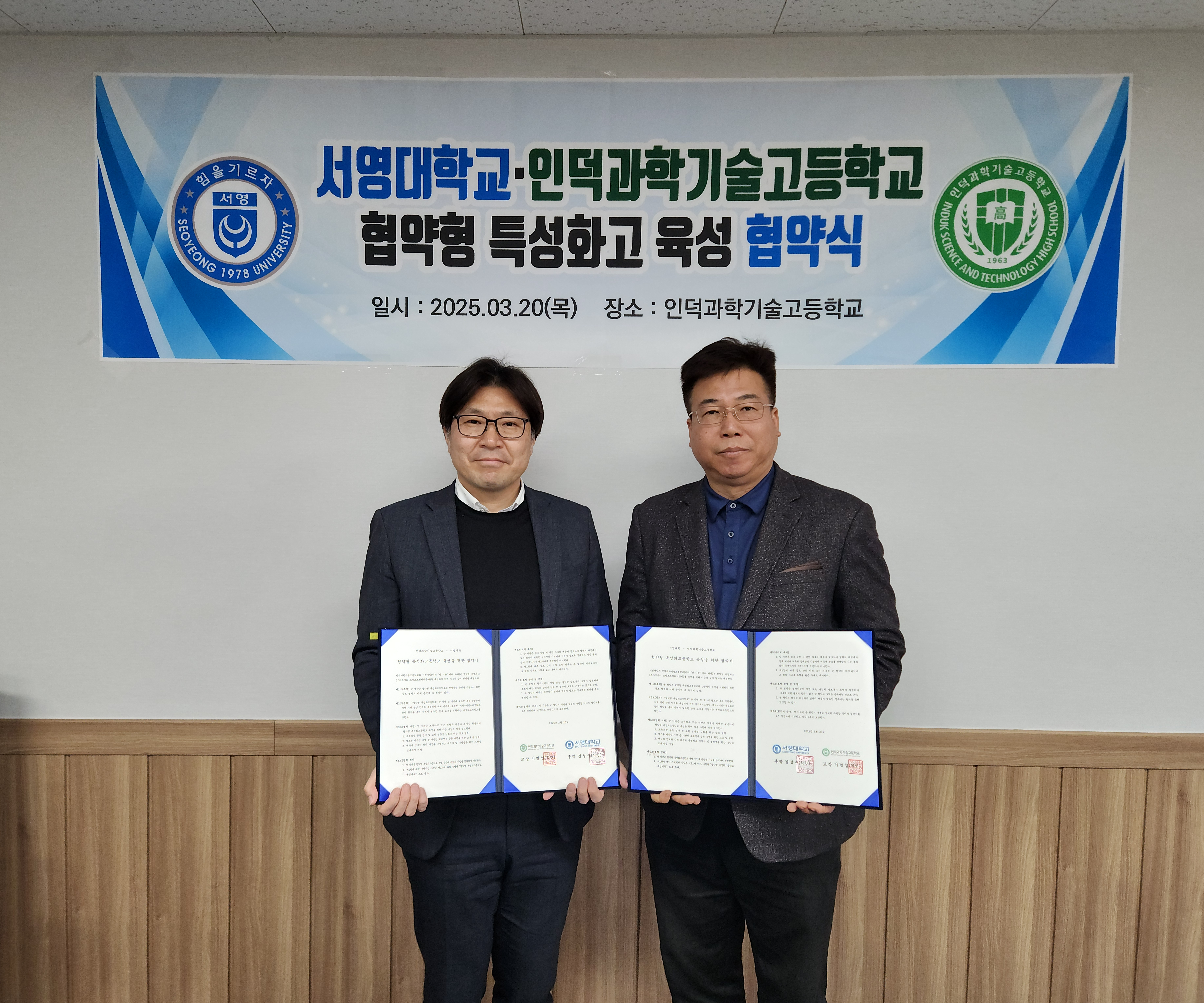 서영대학교(총장 김O수)는 지난 3월 20일(목), 인덕과학기술고등학교(교장 이O섭)과 미래 자동차 분야의 우수 인재 양성을 위한 협약을 체결했습니다. 이번 협약식은 인덕과학기술고등학교에서 진행되었으며, 양 기관의 교육 관계자들이 참석하여 자리를 빛내 주셨습니다.