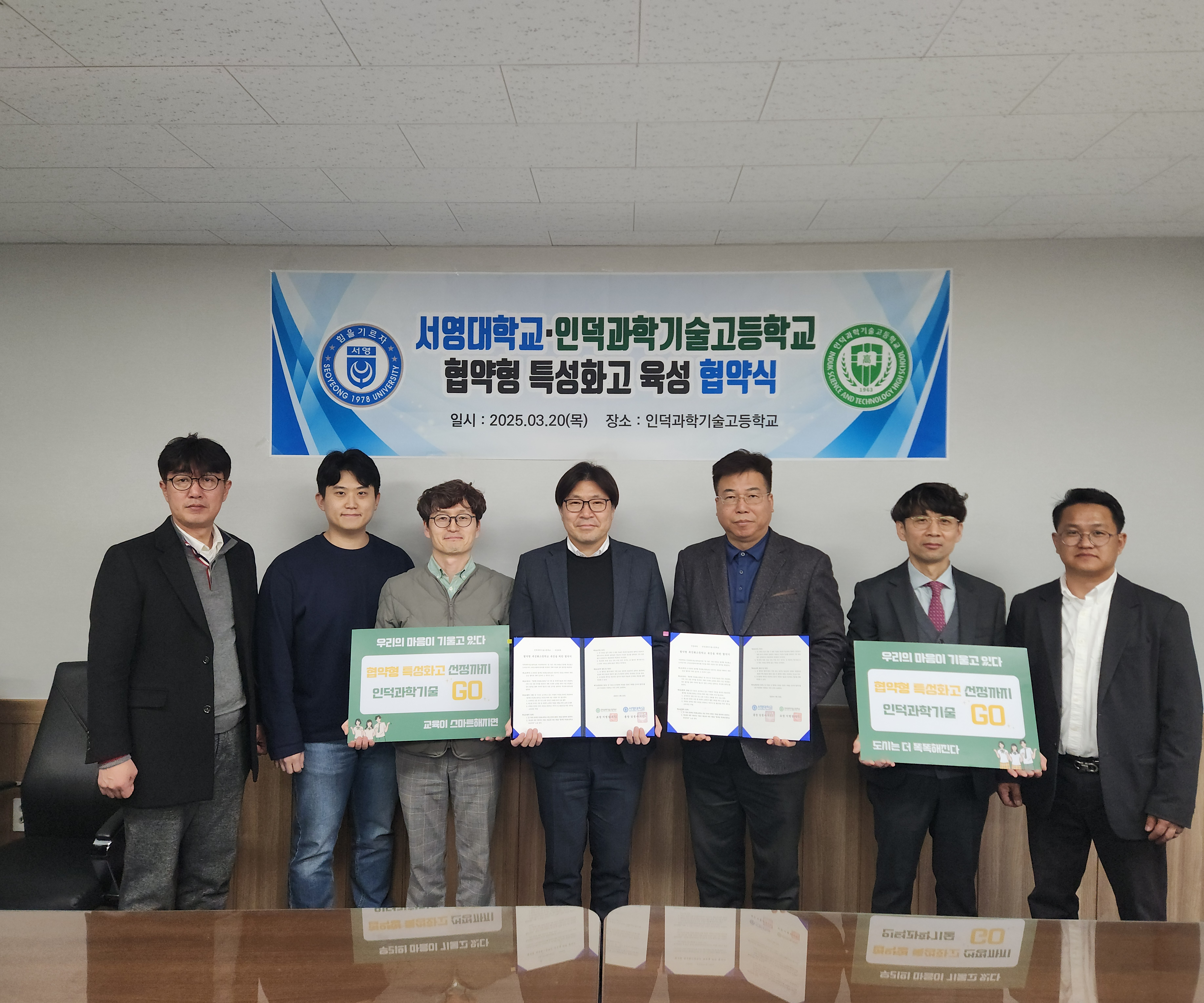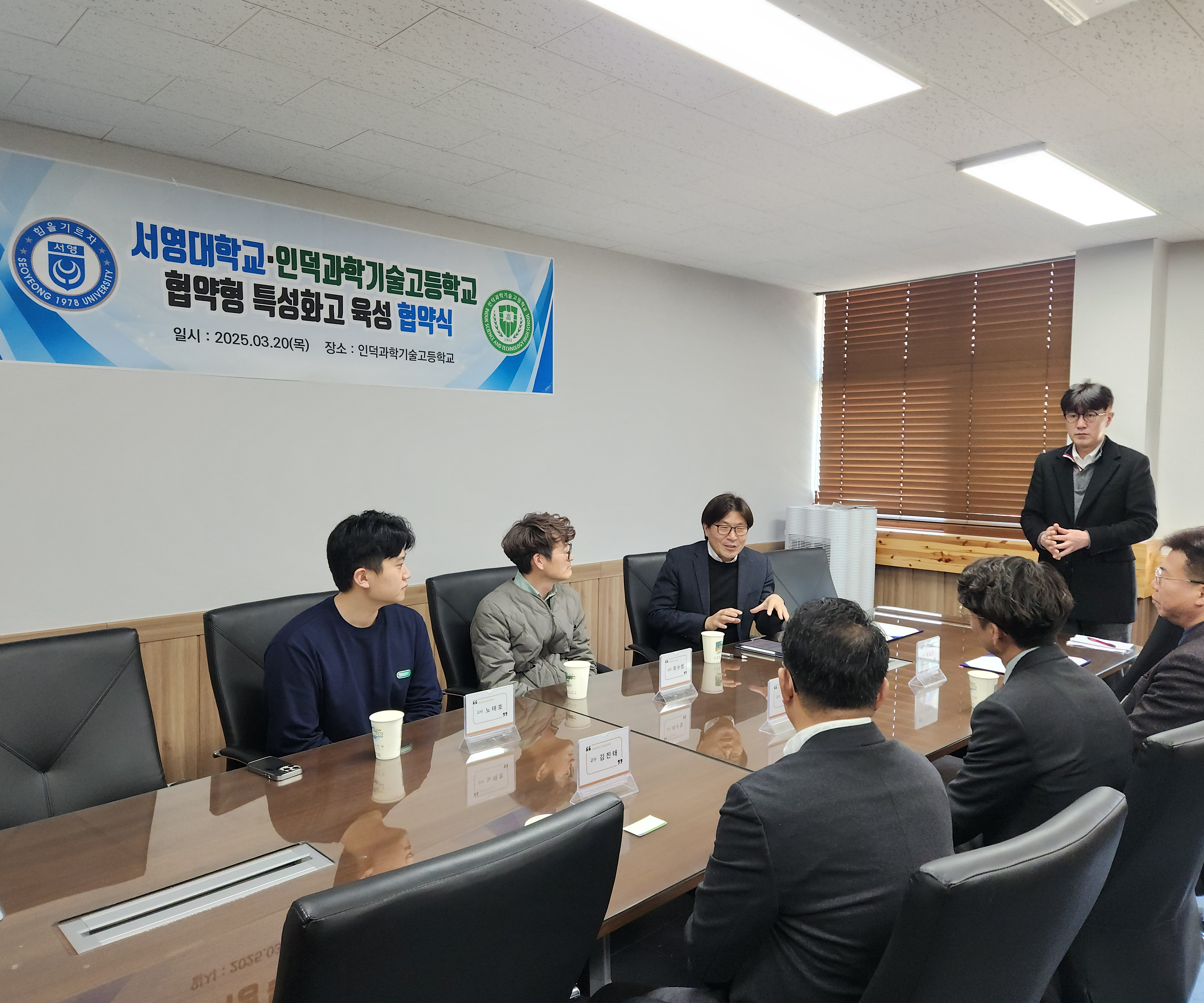 협약식 참석자로는 인덕과학기술고등학교 이O은 교감 선생님과 미래자동차과 교사 이O기, 최O엽, 노O호 서영대학교 에서는 산학협력부단장 봉O준 교수, 미래자동차과 학과장 송O현 교수 미래자동차과 김O태 교수가 참석하였습니다.
