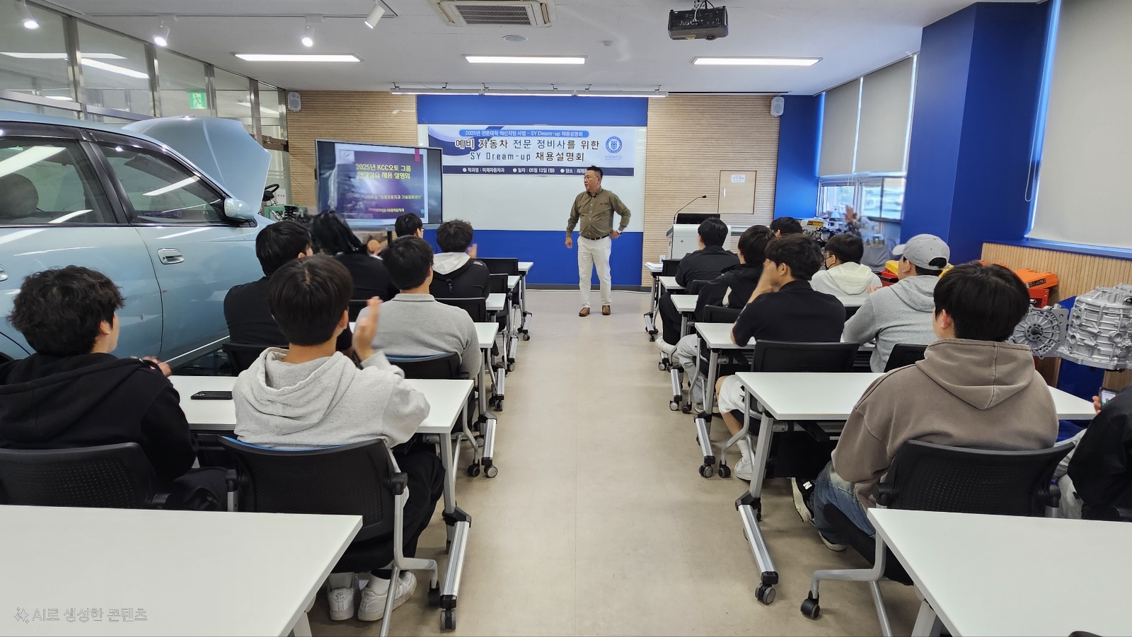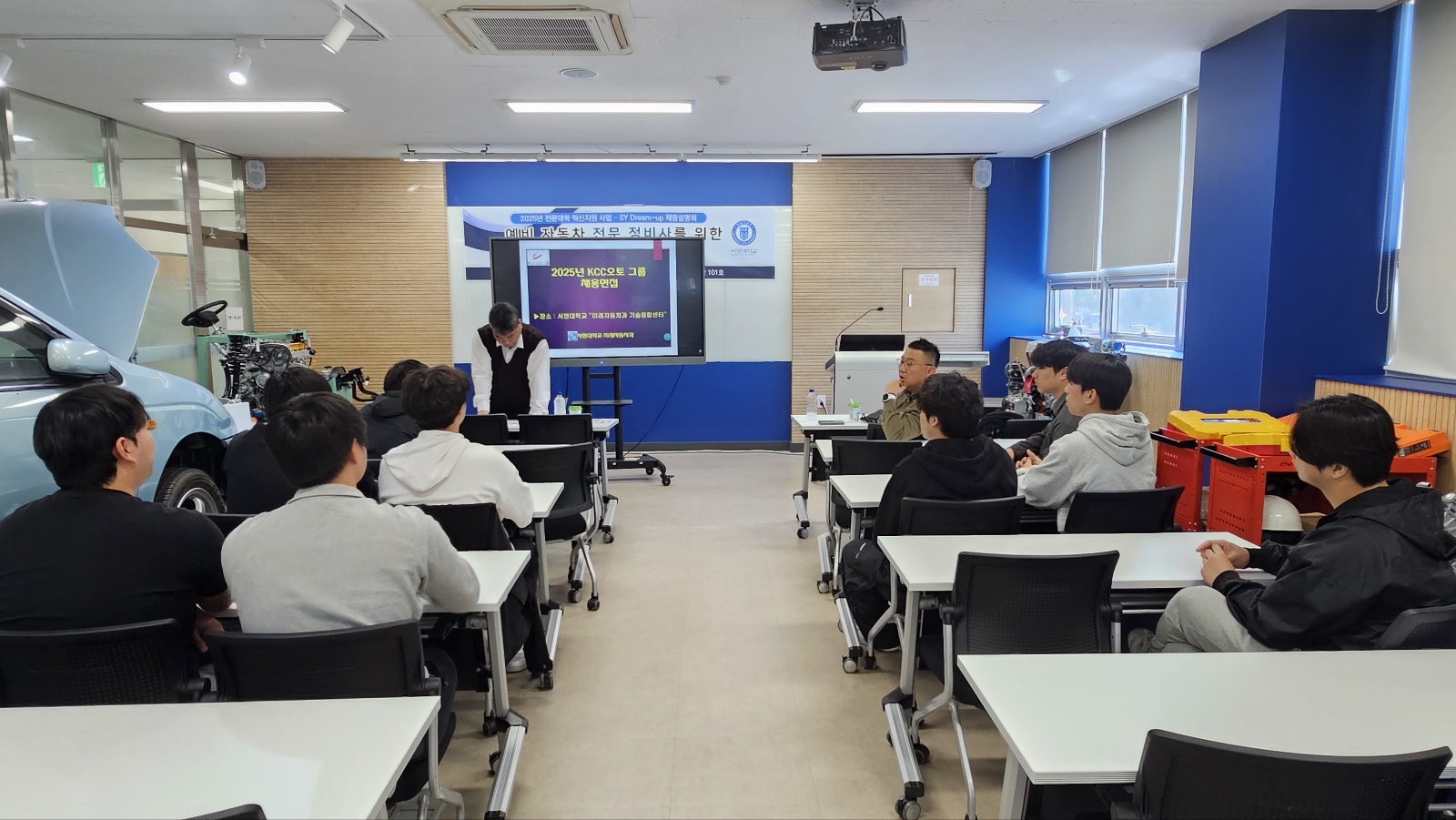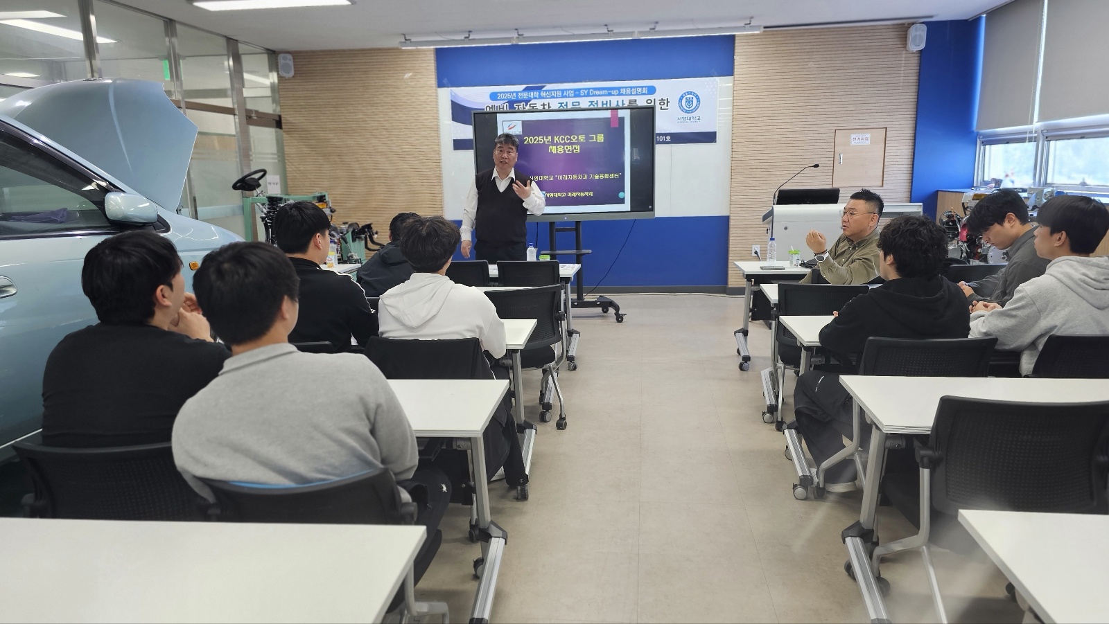 KCC오토그룹 서비스 총괄 김 * 식 전무 이사님과 각 브랜드 본부장 및 이사님 께서 본교 미래자동차과 2학년 재학생들을 위한 특강을 하셨습니다. KCC오토그룹은 벤츠, 포르쉐, 혼다, 닛산/인피니티, 재규어/랜드로버, 지프, 푸조 등 7개 브랜드의 서비스센터와 전시장을 운영하고 있으며