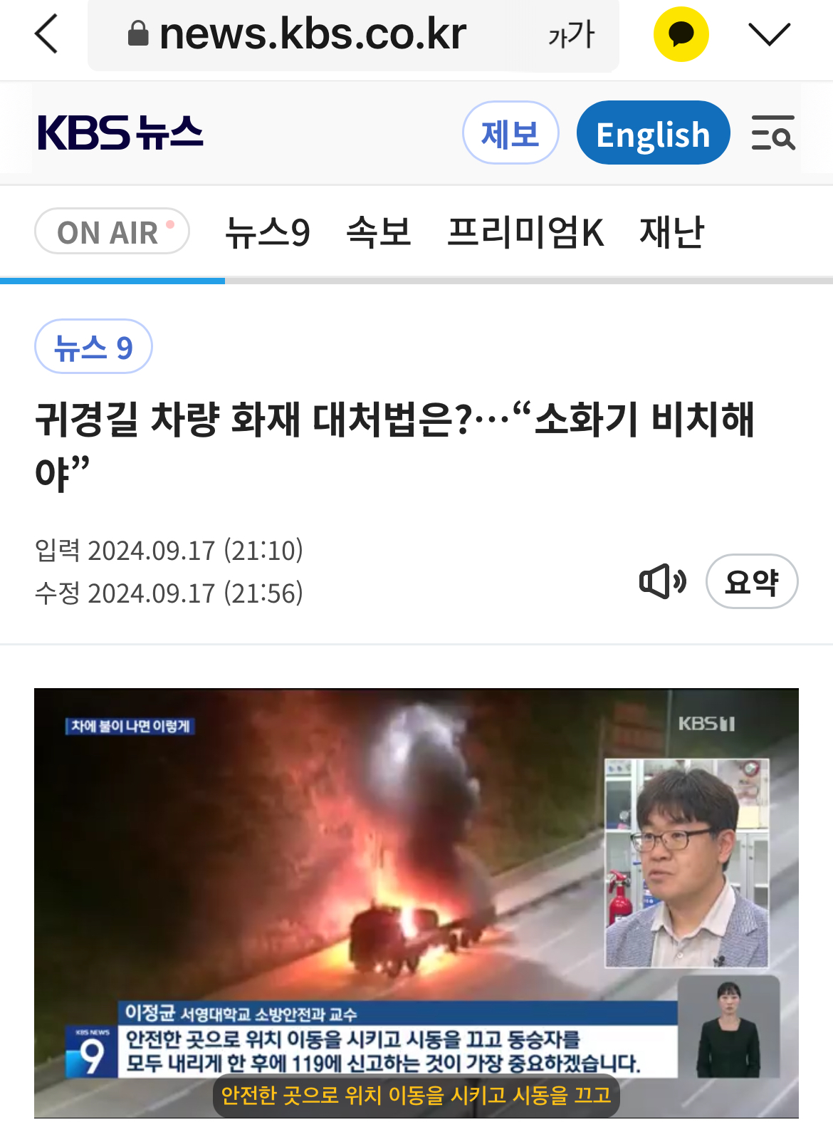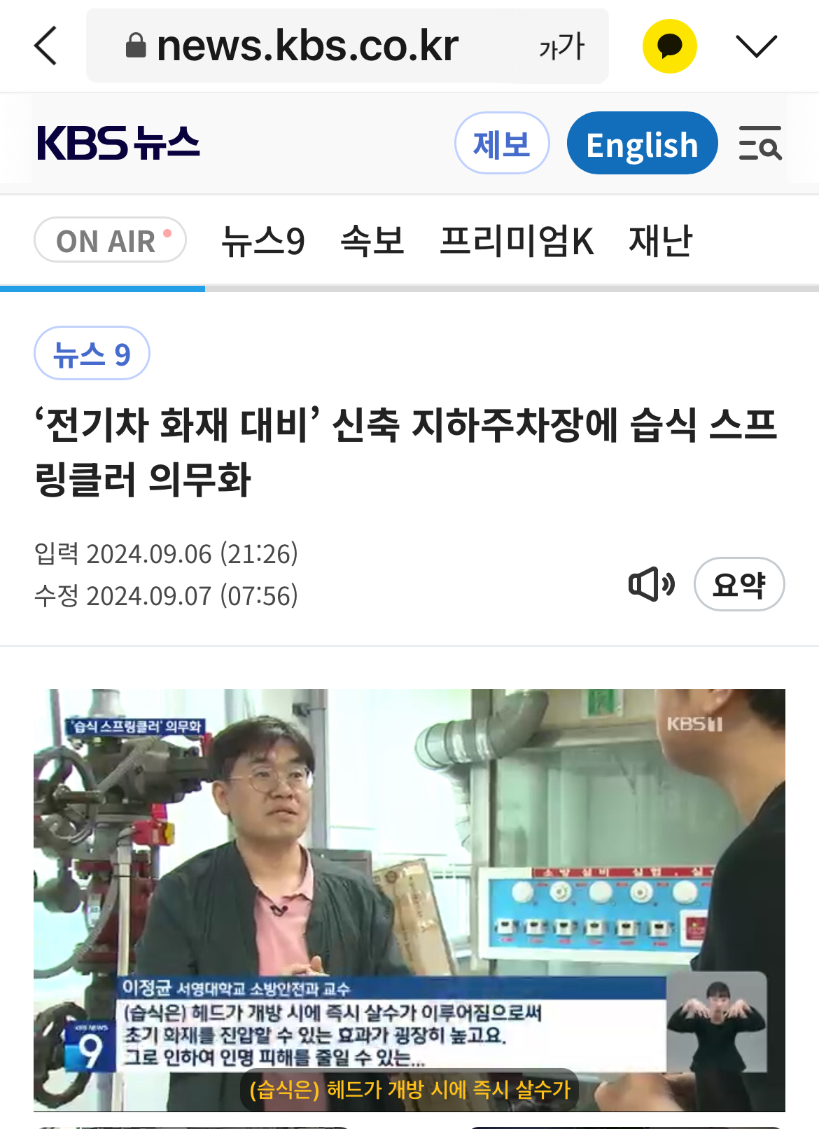 2024.9.17 KBS 1TV 뉴스9 - 차량 화재 시 대피 요령 에 관하여 https://news.kbs.co.kr/news/pc/view/view.do?ncd=8061089 2024.9.6 KBS 1TV 뉴스9 - 전기차 화재 대책 발표 - 습식 스프링클러 도입에 관하여 https://news.kbs.co.kr/news/pc/view/view.do?ncd=8053786
