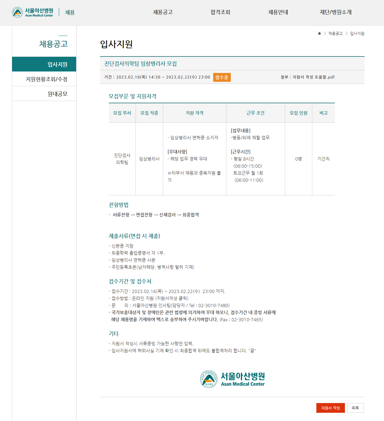 입사지원 | 채용공고 | 서울아산병원 (amc.seoul.kr)