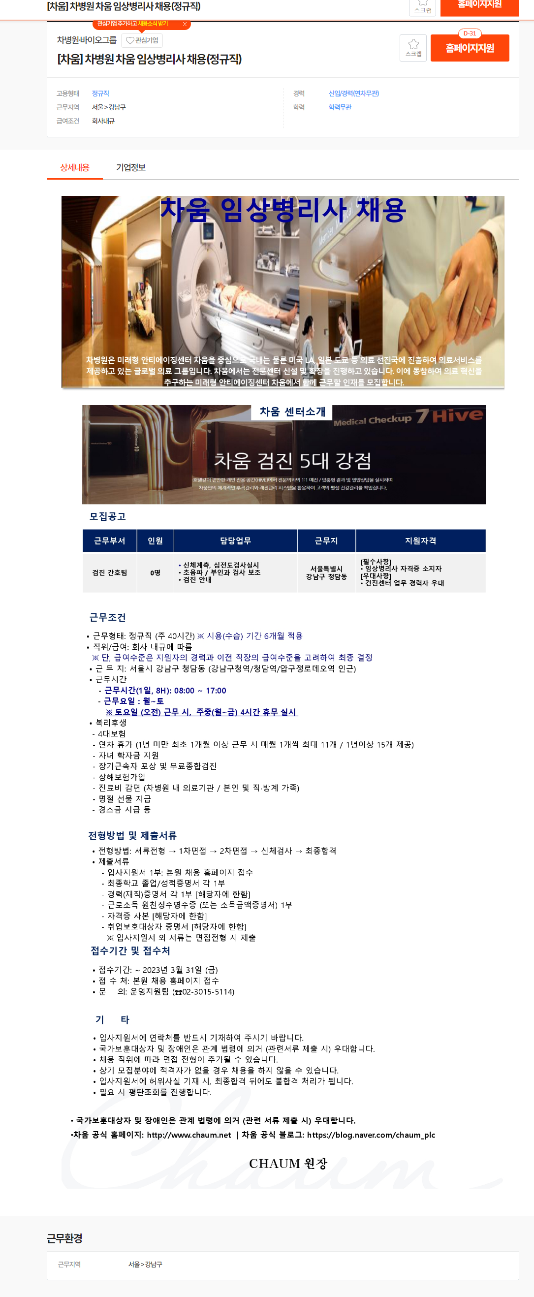 차병원·바이오그룹 채용 : [차움] 차병원 차움 임상병리사 채용(정규직) - 인크루트 채용정보 (incruit.com)