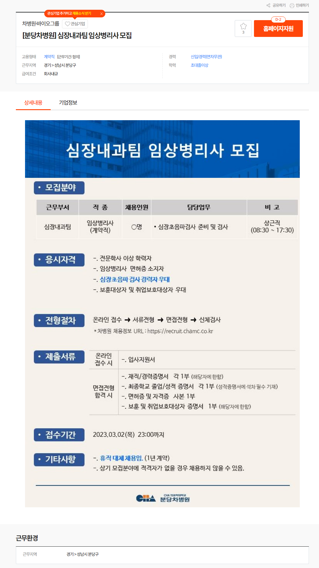 차병원·바이오그룹 채용 : [분당차병원] 심장내과팀 임상병리사 채용 - 인크루트 채용정보 (incruit.com)