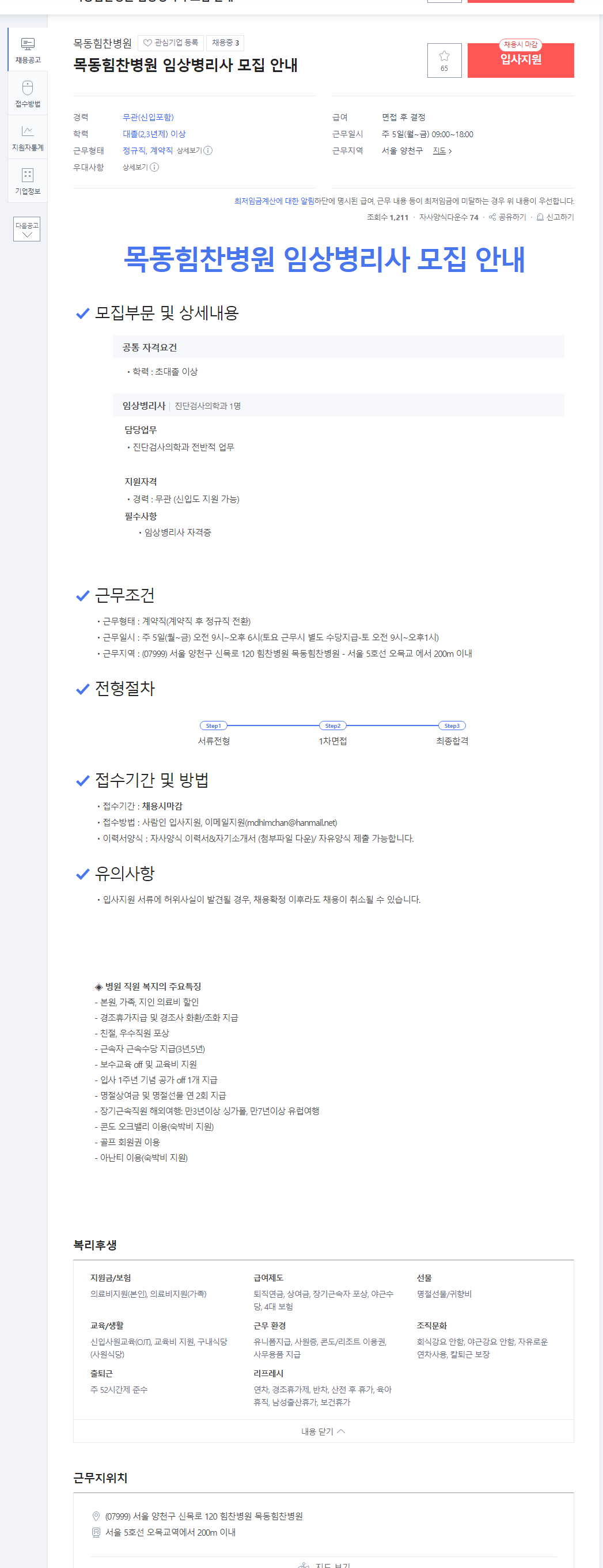 [목동힘찬병원] 목동힘찬병원 임상병리사 모집 안내 (채용시 마감) - 사람인 (saramin.co.kr)