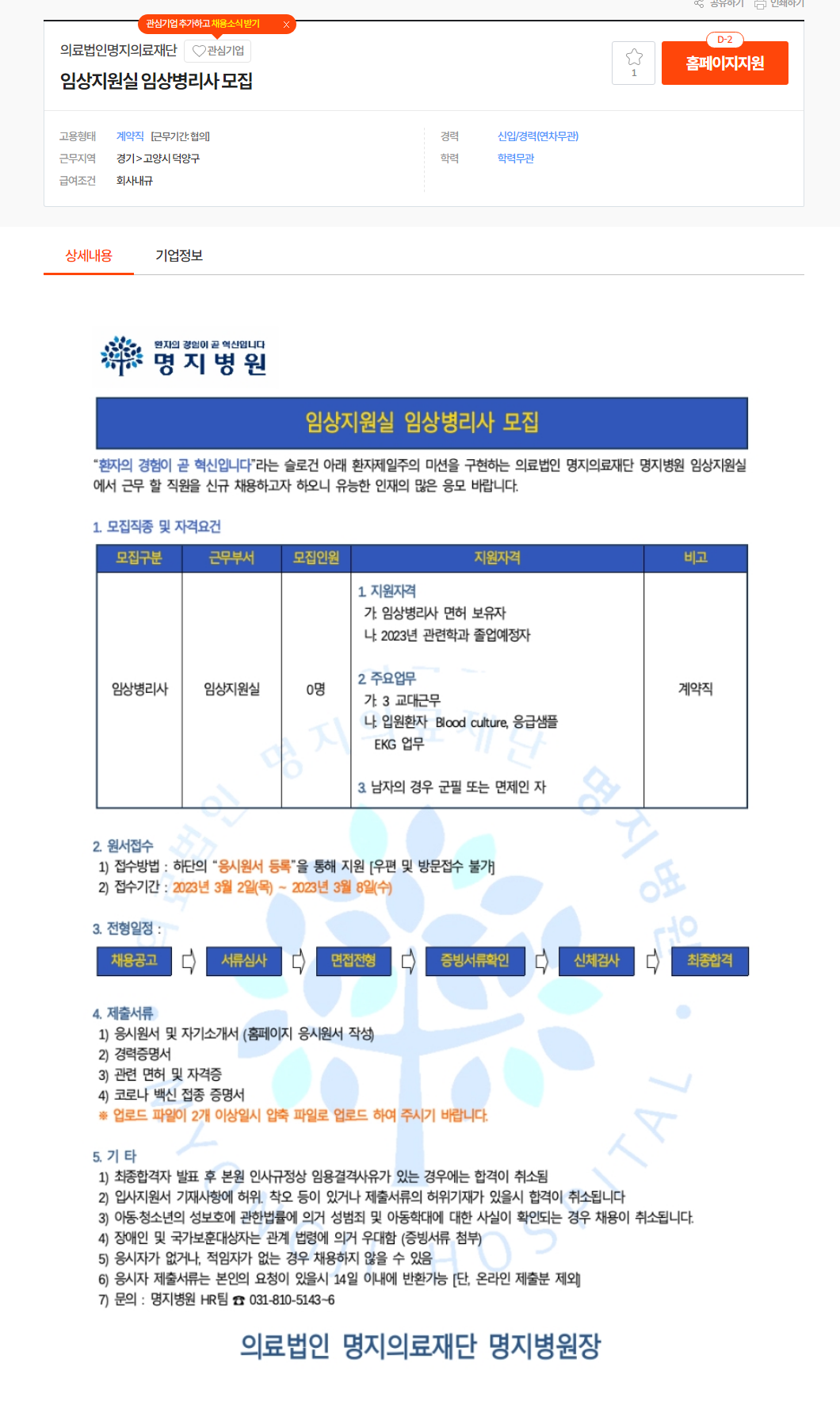 의료법인명지의료재단 채용 : 임상지원실 임상병리사 채용 - 인크루트 채용정보 (incruit.com)