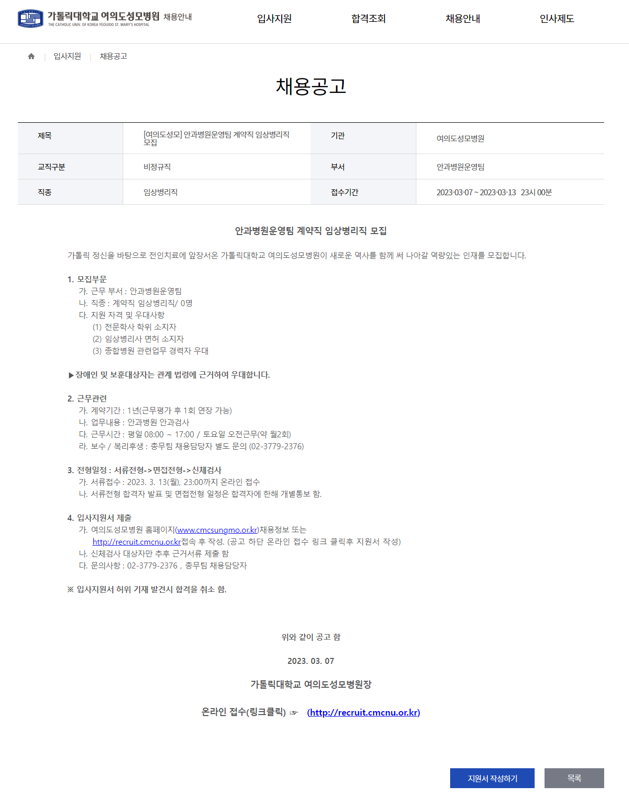 채용공고 - 입사지원 - 가톨릭대학교 여의도성모병원 일반채용 (cmcnu.or.kr)