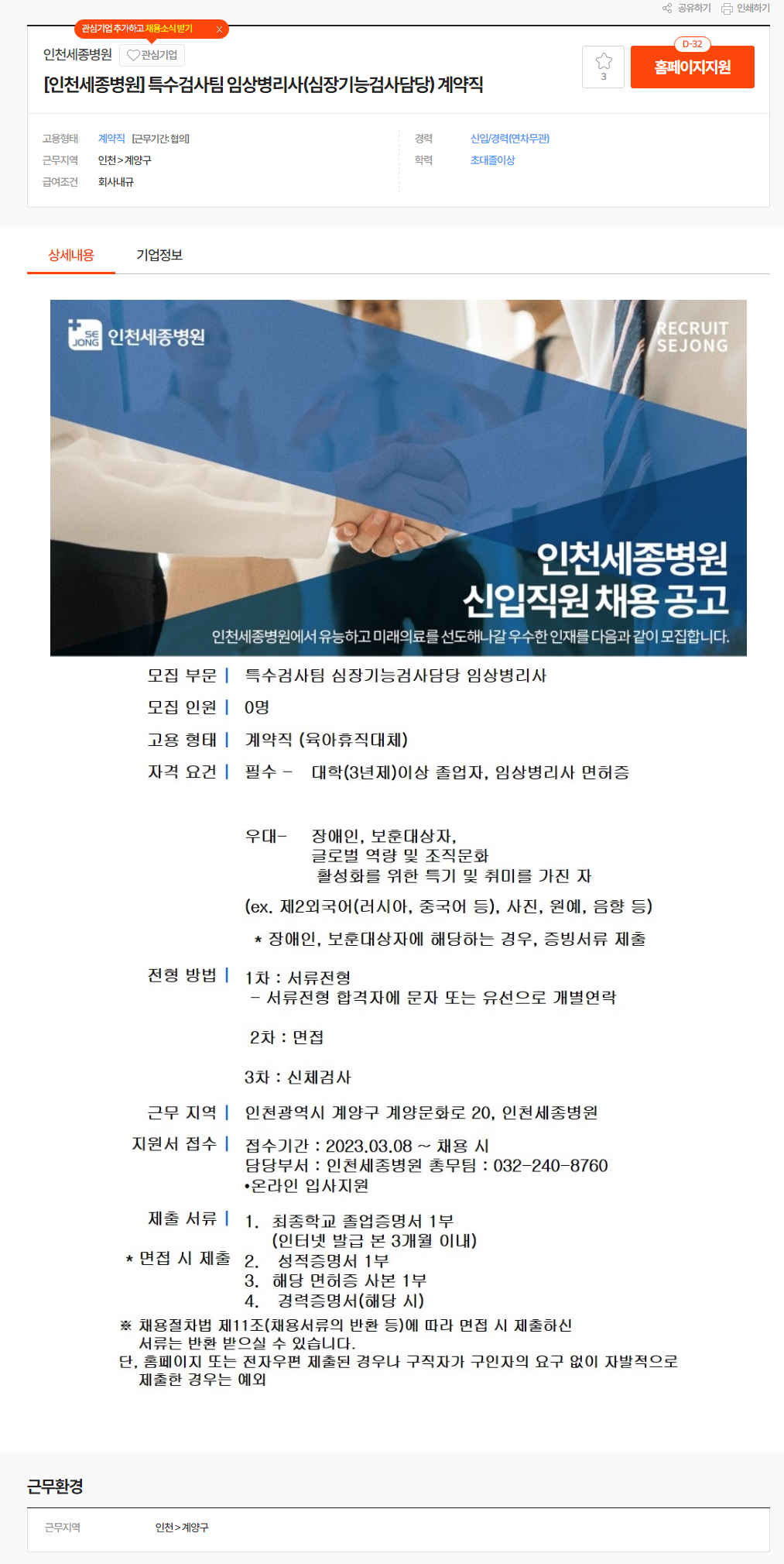 인천세종병원 채용 : [인천세종병원] 특수검사팀 임상병리사(심장기능검사담당) 계약직 채용 - 인크루트 채용정보 (incruit.com)