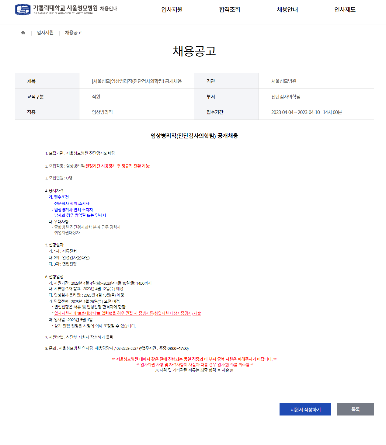 채용공고 - 입사지원 - 가톨릭대학교 서울성모병원 일반채용 (cmcnu.or.kr)