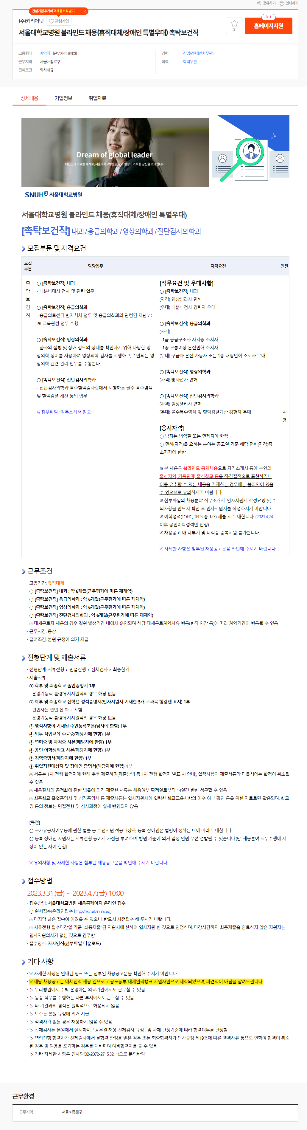 커리어넷 채용 : 서울대학교병원 블라인드 채용(휴직대체/장애인 특별우대) 촉탁보건직 - 인크루트 채용정보 (incruit.com)