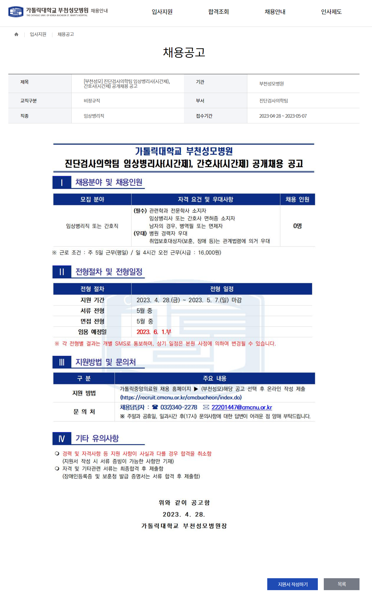 채용공고 - 입사지원 - 가톨릭대학교 부천성모병원 일반채용 (cmcnu.or.kr)