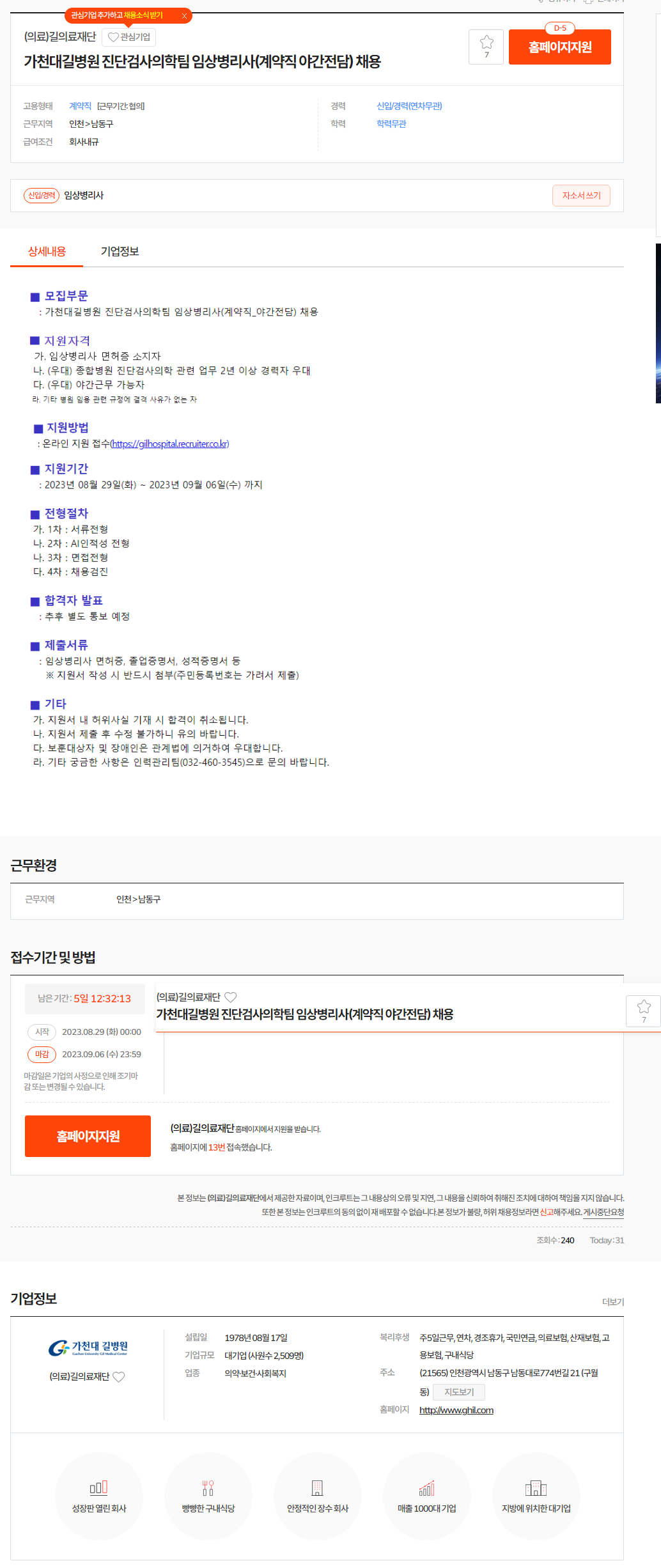 의료길의료재단 채용 : 가천대길병원 진단검사의학팀 임상병리사(계약직 야간전담) 채용 - 인크루트 채용정보 (incruit.com)