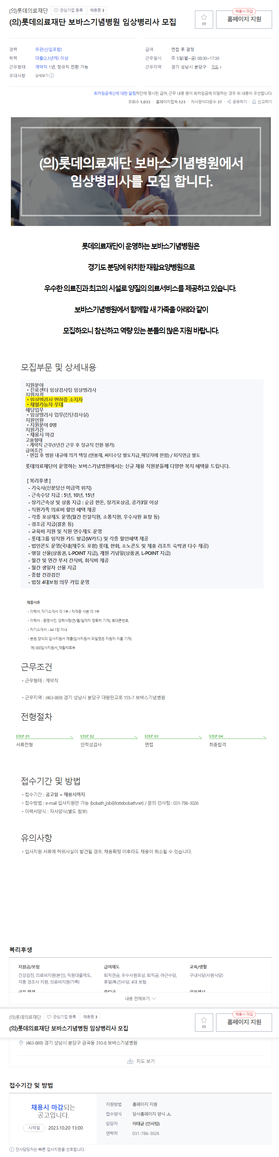 [(의)롯데의료재단] (의)롯데의료재단 보바스기념병원 임상병리사 모집 (채용시 마감) - 사람인 (saramin.co.kr)