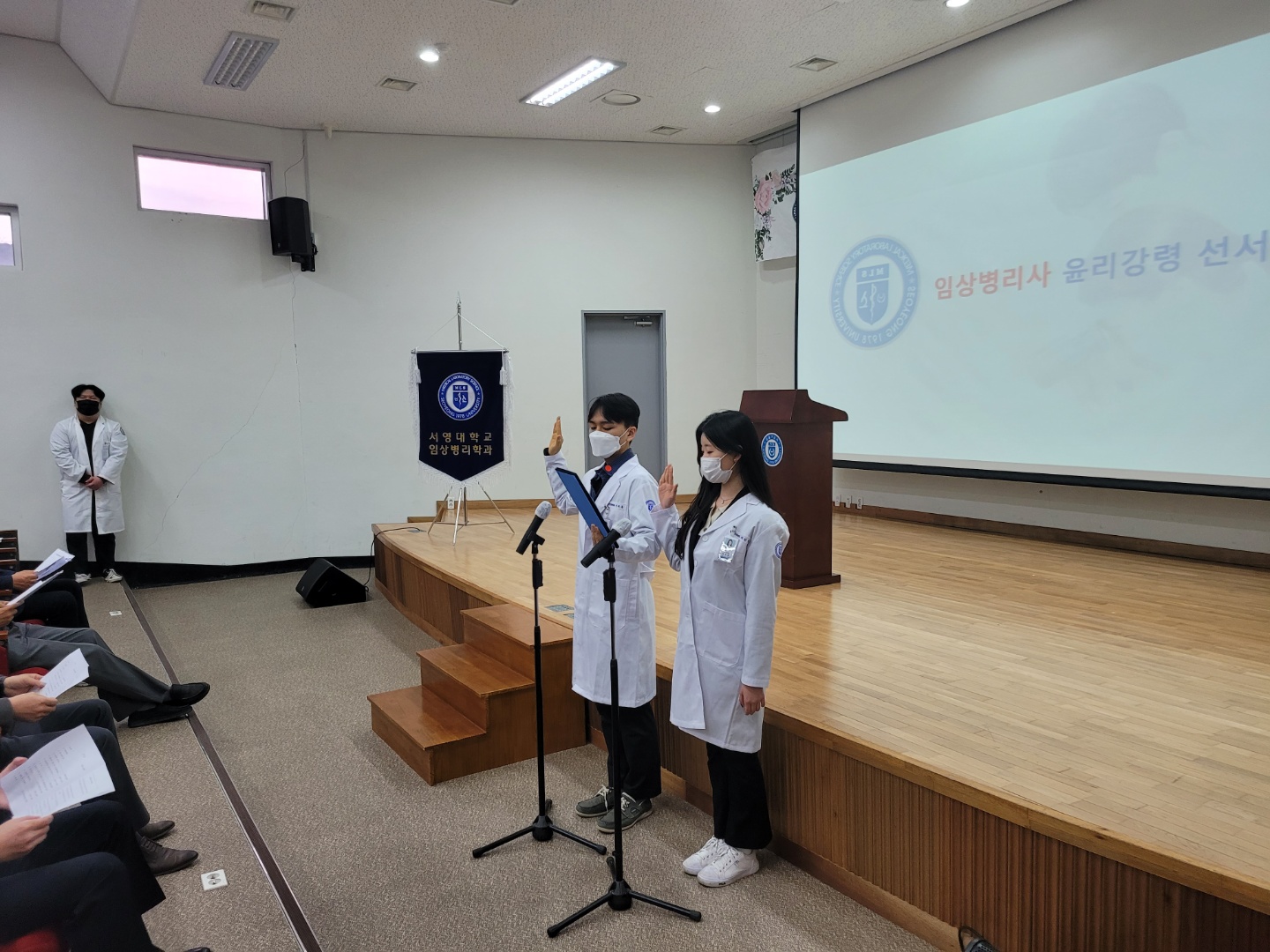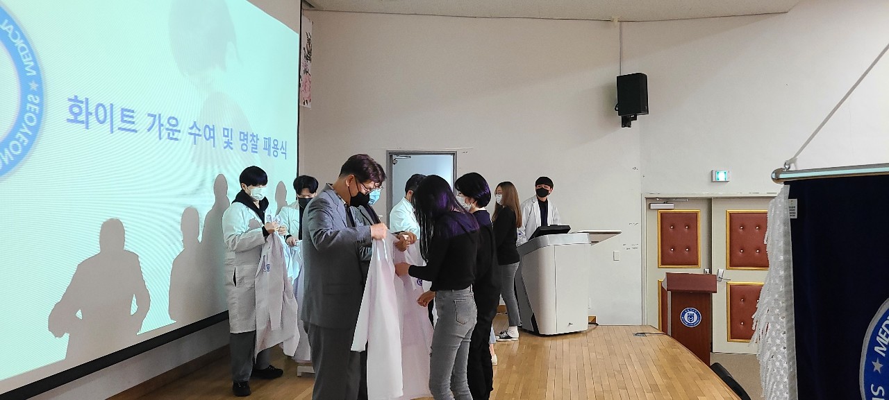 46명의 예비임상병리사는 각자의 이름이 새겨진 화이트 가운과 명찰을 수여받고, "임상병리사 윤리강령"을 낭독하며 박애와 봉사의 정신으로 국민건강에 이바지할 것을 다짐했다. 더불어 21학번 김준성 학생은 경기도 임상병리사협회의 장학생으로 선발되어 이광우 회장님으로부터 장학증서를 수여받았다.