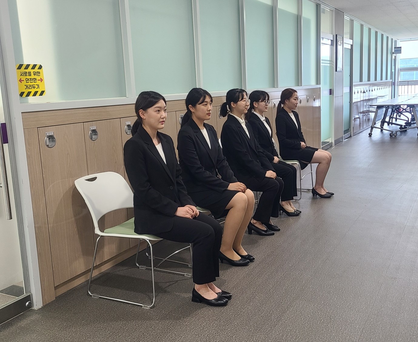 각 조별로 면접에 임하였고 이어서 면접의 기본자세, 주어진 짧은 시간동안 면접관에게 좋은 인상을 남길 수 있는 질의 응답 태도와 요령, 그리고 학생들의 제출서류에 대한 수정사항 등을 맞춤 지도 받았습니다.