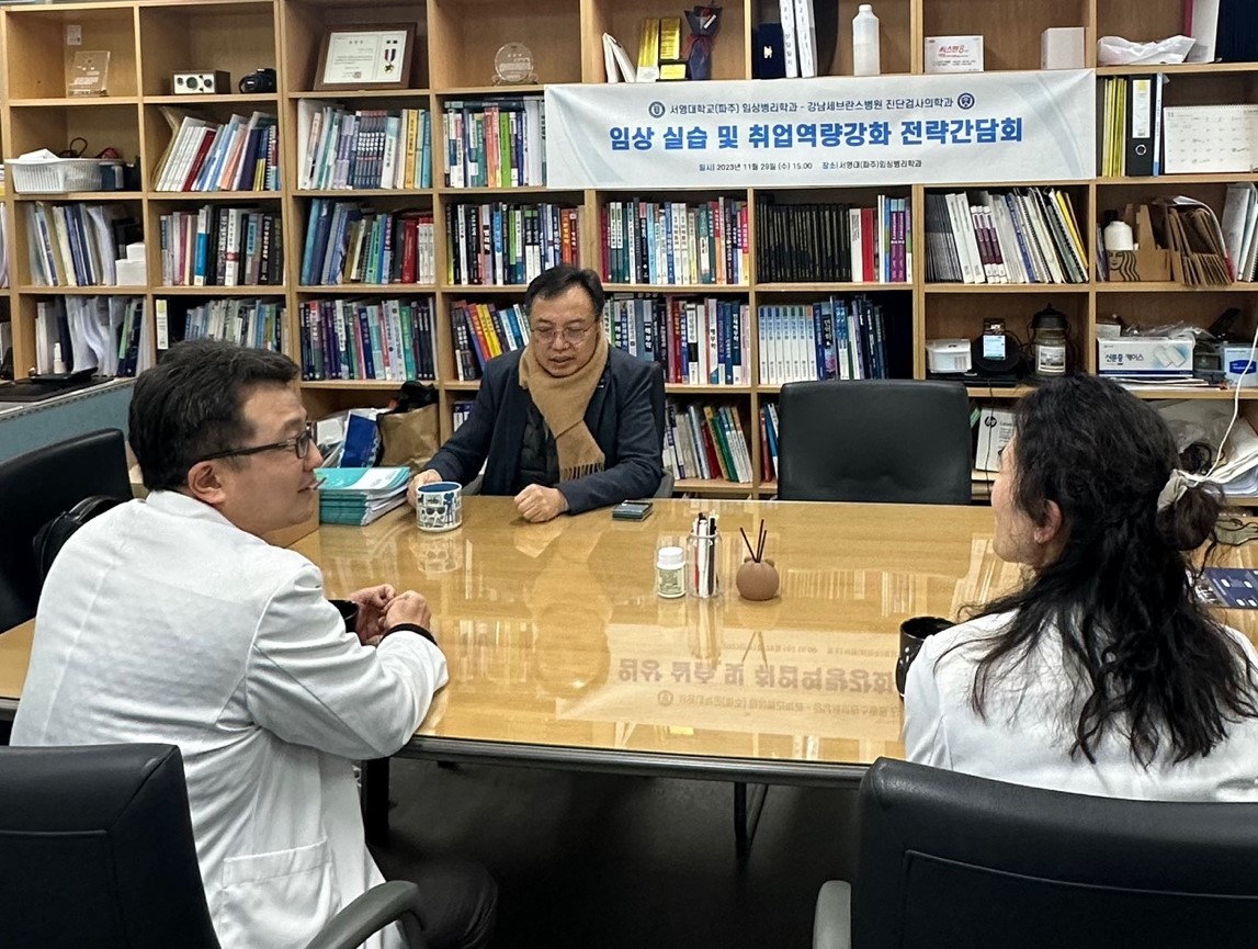 지난 28일(화) 서영대학교 임상병리학과(학과장 이지웅)와 연세의료원 강남세브란스병원 진단검사의학과(팀장 김건한)는 서영대학교(파주) 임상병리학과 재학생들의 경쟁력을 키우기 위한 "임상 실습 및 취업역량강화 전략간담회"를 가졌다. 간담회 참석에는 강남세브란스병원 진단검사의학과 김건한 팀장(대한임상병리사협회 학술부회장), 서영대학교 임상병리학과 이지웅 학과장, 김아름 교수, 이경배 교수가 참석하였다.