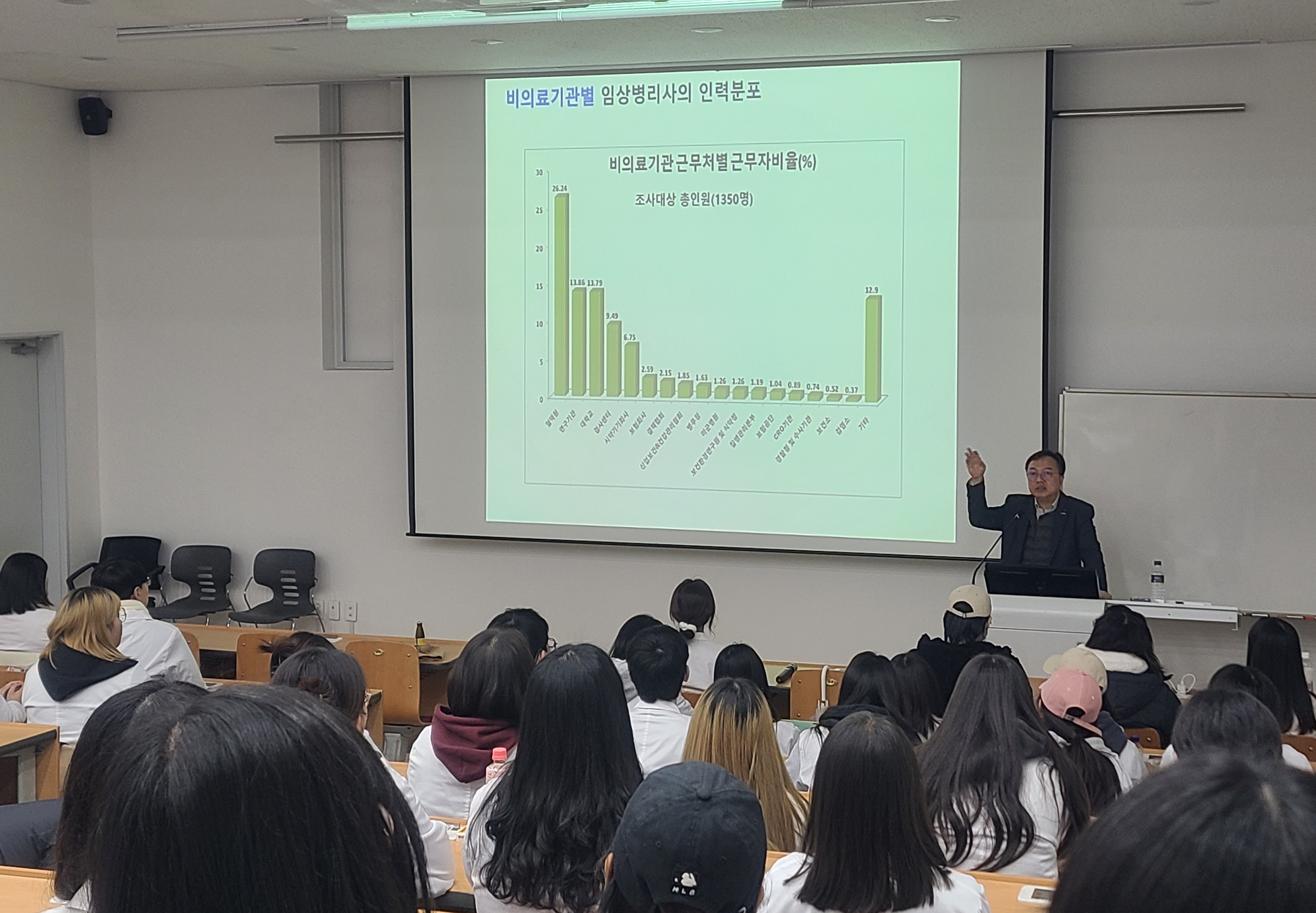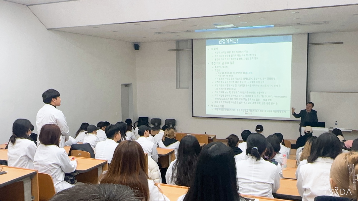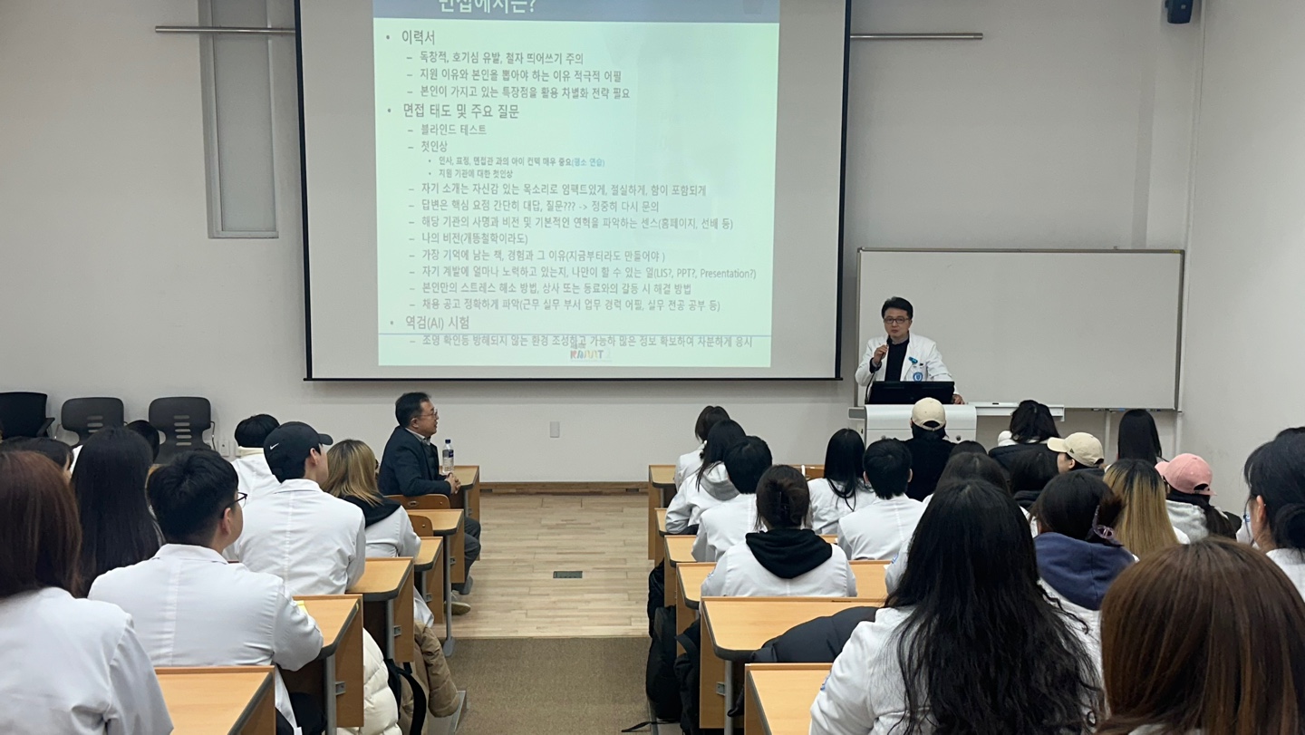 이 날, 1학년 재학생들은 의료기관에서 임상병리사의 업무범위 및 진출할 수 있는 다양한 분야, 비의료기관에서의 임상병리사의 진출 현황에 대해 최근 통계 자료를 바탕으로 자세한 정보를 전달받을 수 있었습니다. 또한 근래의 채용에 필요한 필수 조건 및 면접에 임하는 바른 자세 등의 알찬 노하우 등을 멘토님으로부터 들을 수 있었습니다.