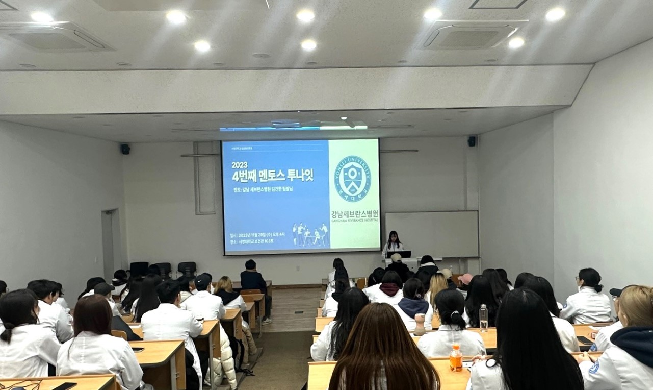 지난 11월 29일, 우리대학 보건관 컨퍼런스룸에서 최강임상학생회가 준비한 네번째 "Mentors Tonight" (사회 : 학회장 정바다) 프로그램이 1학년 재학생을 대상으로 진행되었습니다.