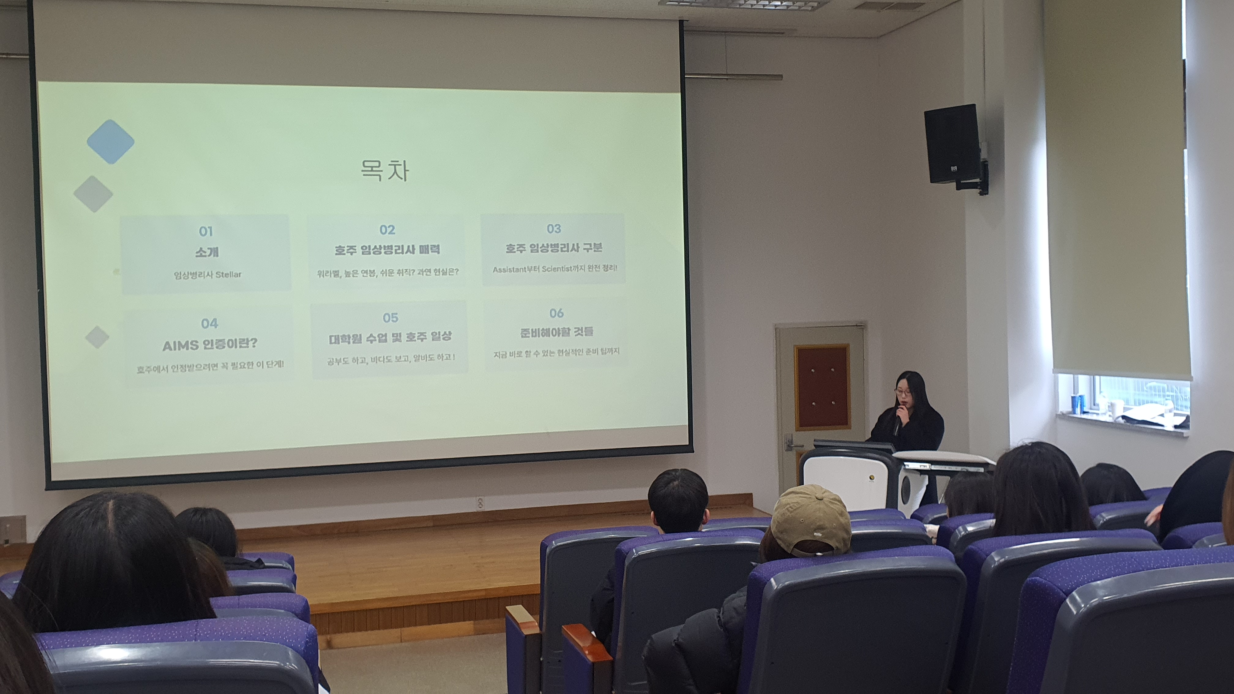 이번 특강은 국내에서 임상병리사로 3년간 근무한 뒤, 현재 RMIT University 석사 과정에 재학 중인 전은영 강사를 초청해 마련되었으며, 호주 임상병리사 제도와 현지 생활, 대학원 진학에 대한 구체적인 설명을 중심으로 구성되었다.