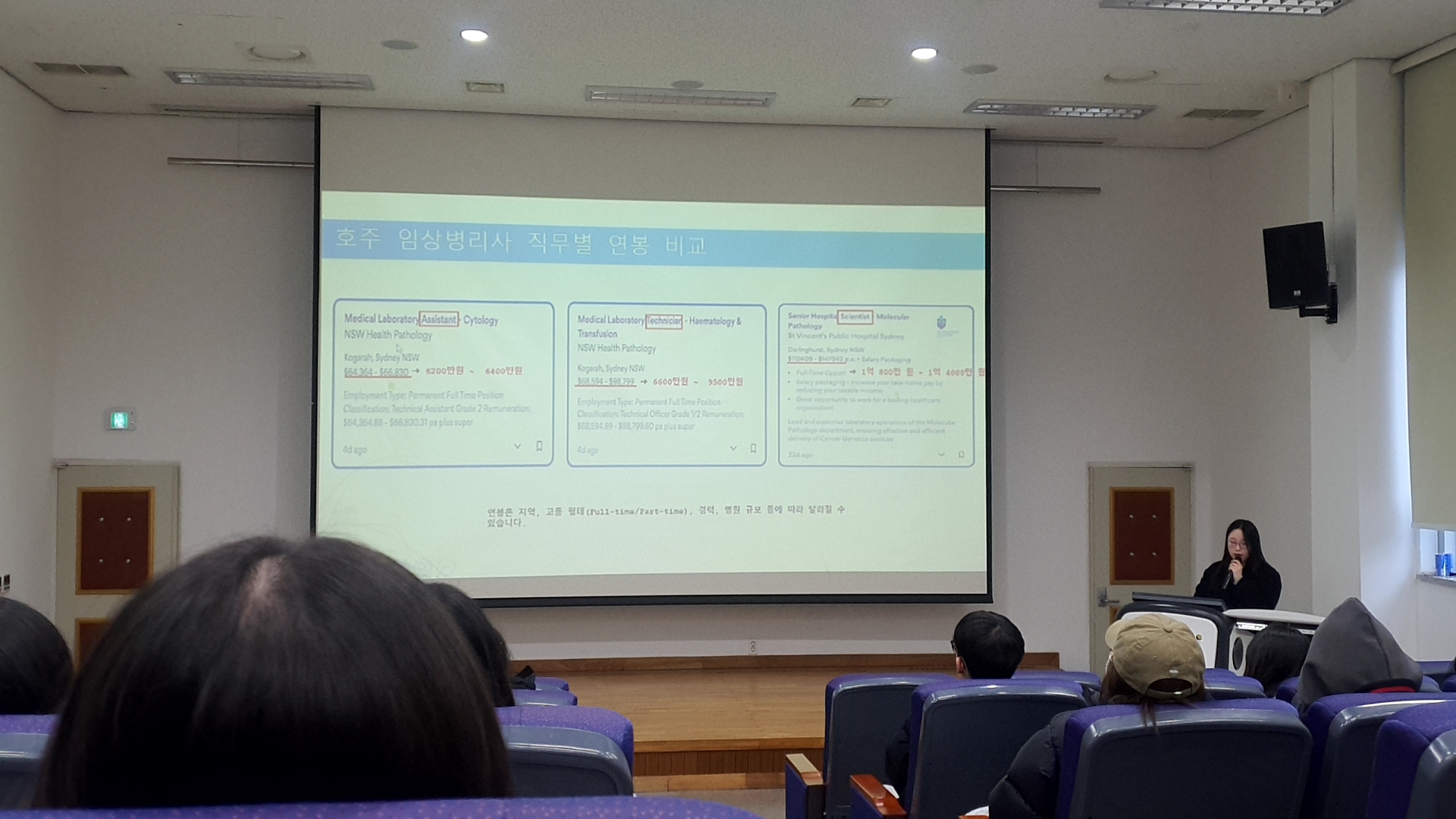 특강에서는 호주에서의 일상과 의료 환경을 소개하며, 한국과 다른 호주 임상병리사 취업 과정과 제도적 특징에 대해 설명했다. 이어 호주 내 임상병리사 직무 구분과 각 직무별 역할, 근무 형태를 구체적으로 다루었으며, 학생들의 관심이 높은 직무별 연봉 수준도 함께 소개해 글로벌 임상병리사에 대한 이해를 높였다.