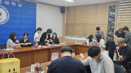 청라봉사단에서 봉사활동을 하기 위해 오후3시에 서영대학교 물리치료과와 조선간호대학교 간에 사전 간담회를 실시했습니다. 사전에 어떻게 해야할지에 대한 의견들을 수렴하여 좋은 방향으로 계획을 세웠으며, 간단한 테이핑의 기능에 대해 설명해주었습니다. 또한, 2인1조로 통해 실습을 진행하였고, 서로 테이핑을 하면서 잘 되지 않는 부분들을 알려주는 시간보냈습니다.