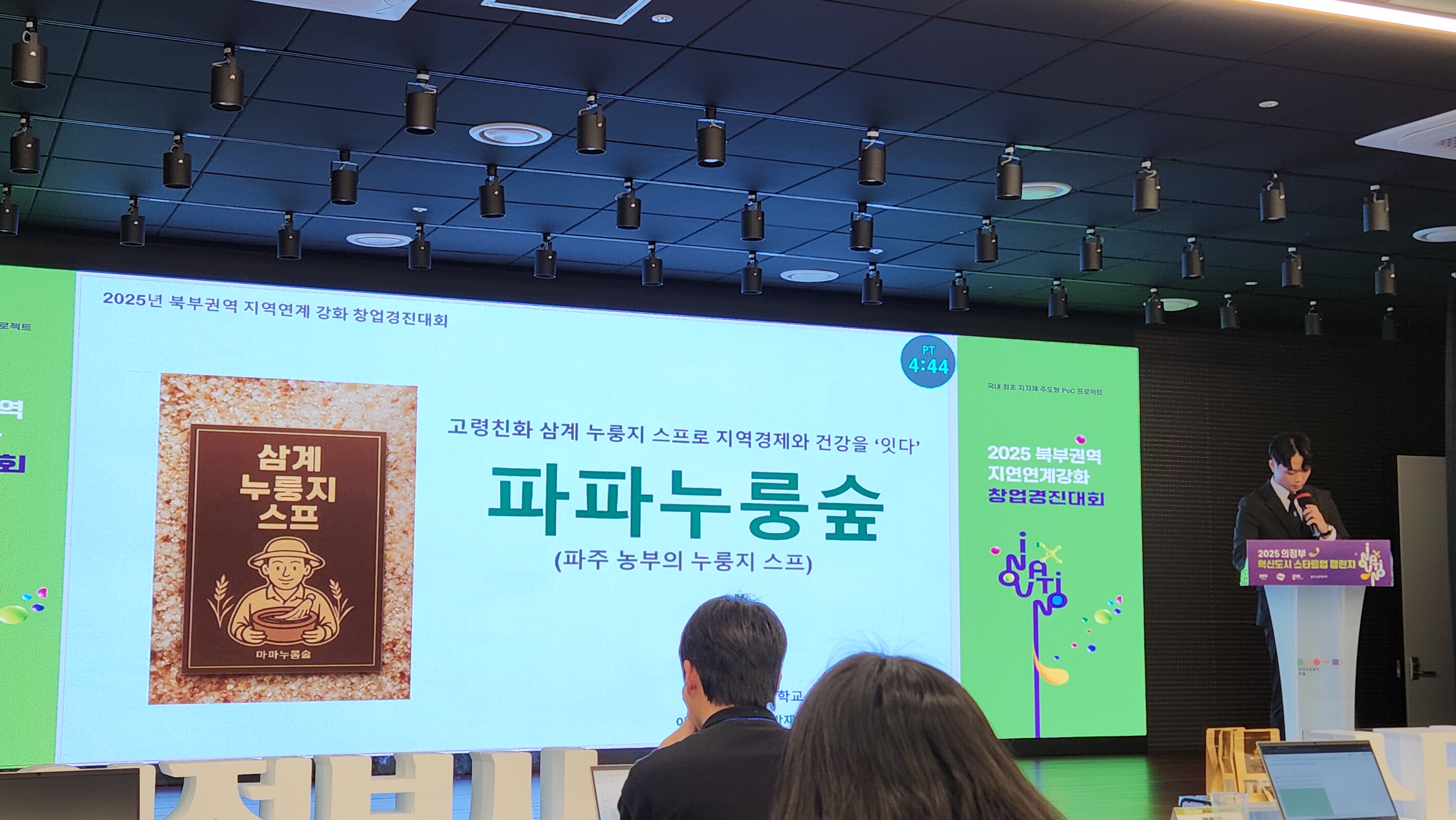 O. 이번 ‘2025 북부권역 지역연계 강화 지원 학생 부문 창업경진대회’는 12개 대학에서 참여한 총 17개의 팀 가운데 예선을 통과한 10개의 팀이 본선에서 경합을 벌였다. 우리대학 사회복지행정학과 재학생들은 지역 농산물 활용과 고령층 영양 문제에 주목하여 고령친화 삼계누룽지 스프, 파파누룽숲을 개발하였다. 해당 제품은 정부미 및 지역 특산 농산물 재고 누적, 노년층의 조리 부담과 저작 어려움, 영양 불균형 및 식사 소외 등 여러 문제를 동시에 해결하고자 하는 지속가능한 순환형 고령친화 식품 솔루션이라는 평가를 받았다.