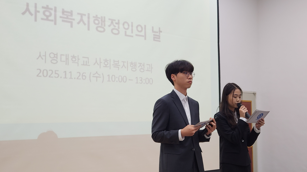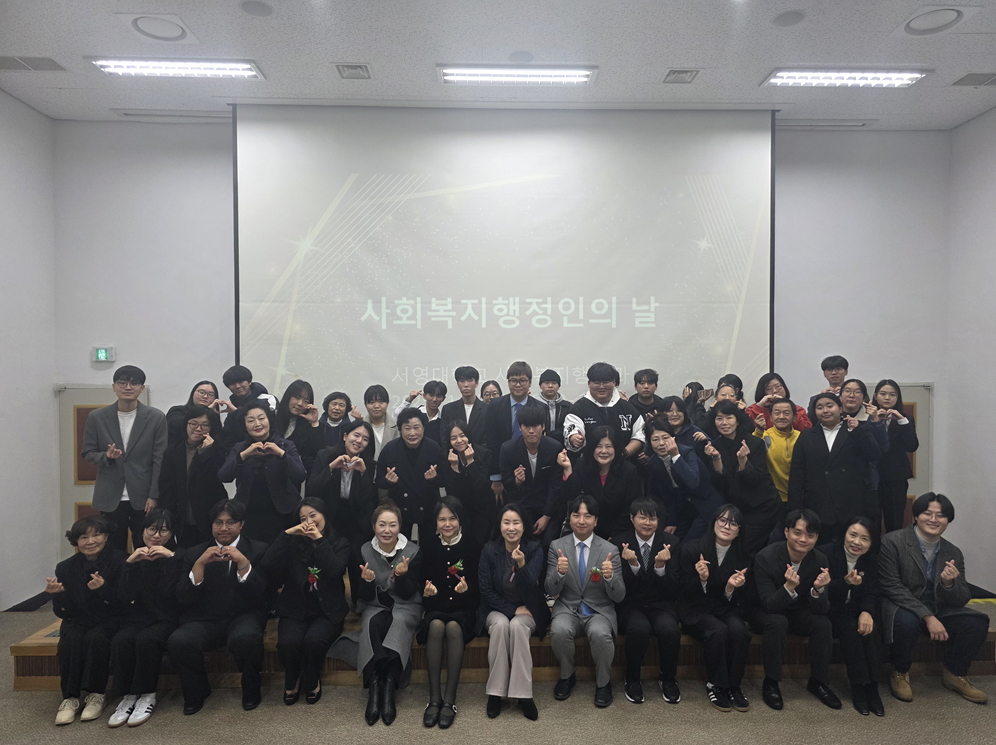 O. 우리대학(총장 김정수) 사회복지행정과(학과장 김효선)는 지난 11월 26일(수) 서영홀에서 ‘2025 사회복지행정인의 날’을 개최하였다. 행사에는 사회복지행정과 교수진과 재학생 50여 명이 참석했으며, 2학년 졸업예정자를 중심으로 사회복지사 선서식을 진행하고, 교수진에 대한 감사의 마음을 전하는 사은회를 통해 예비 사회복지사로서의 전문성과 윤리 의식을 다지는 시간이 되었다.