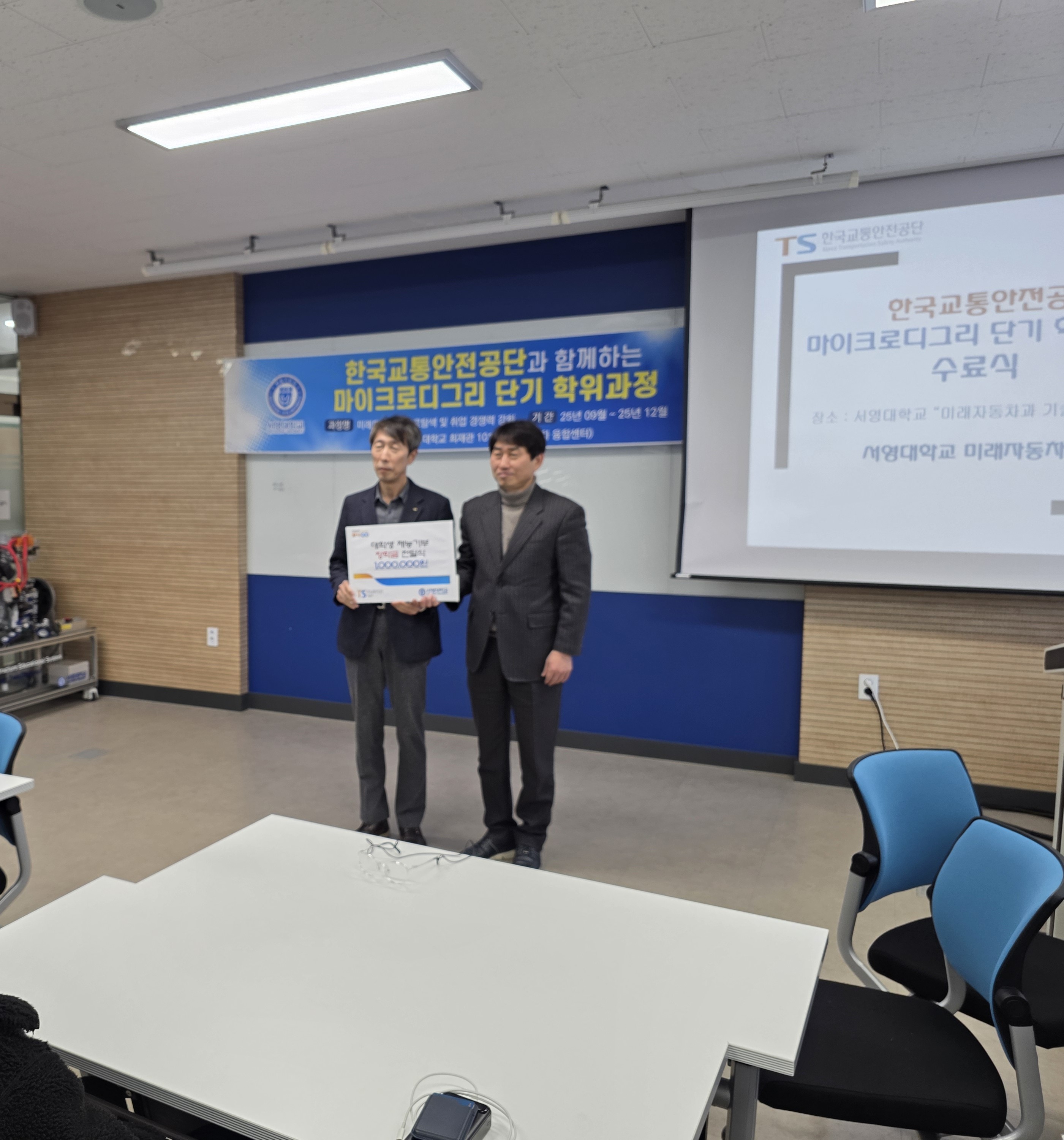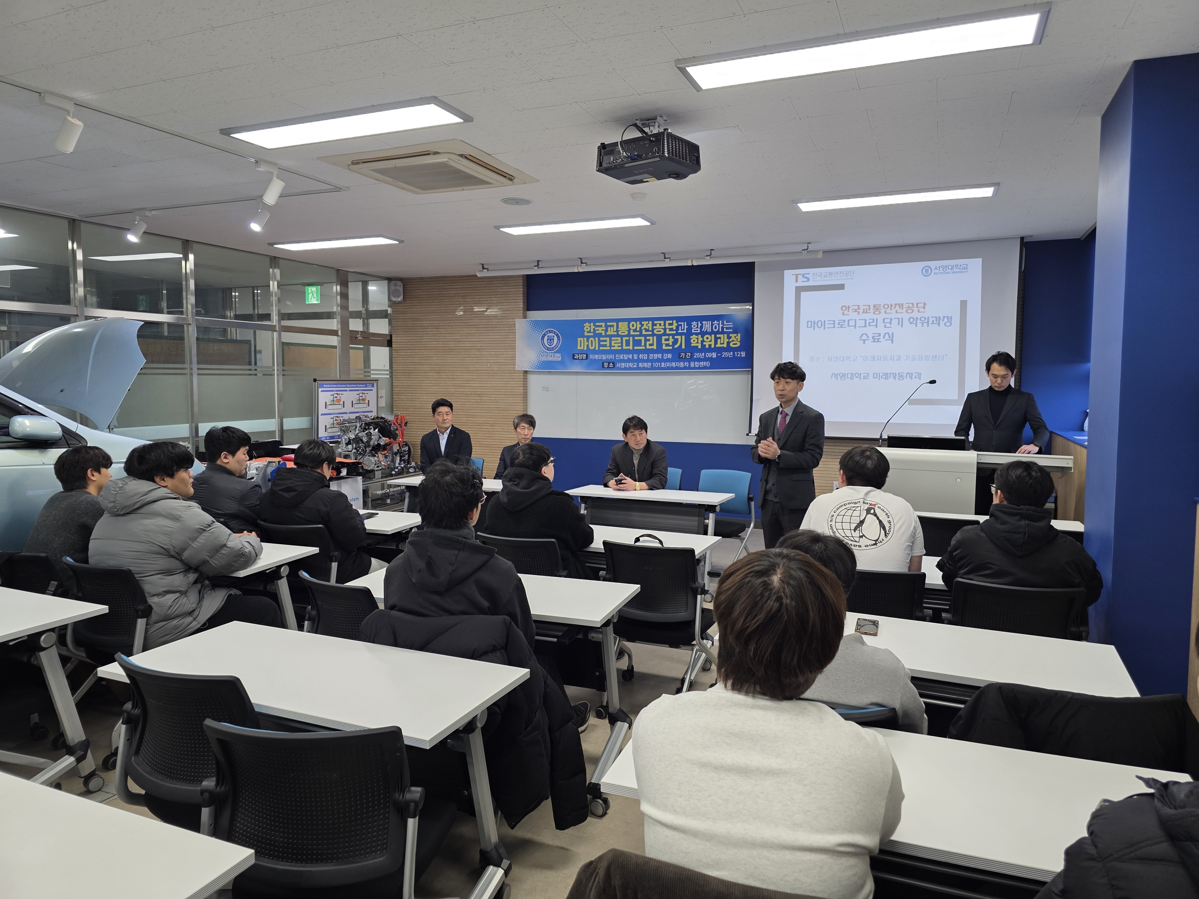서영대학교(총장 김정수) 미래자동차과(학과장 송락현)20251212() 한국교통안전공단 서울본부와 공동으로 운영한 마이크로디그리 단기 학위과정의 성공적인 운영을 기념해 수료식 및 장학금 수여식을 진행하였다.
